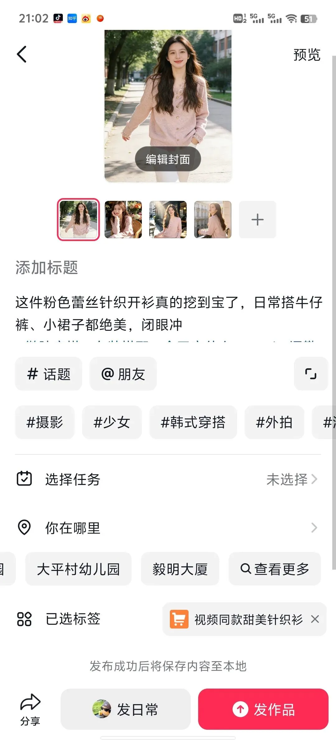 最后一步,发布作品挂小黄车。打开带货平台,上传图片,配上文案(也可以直接让AI生成➕人工润色),带上服装相关话题,选择橱窗对应的衣服发布。