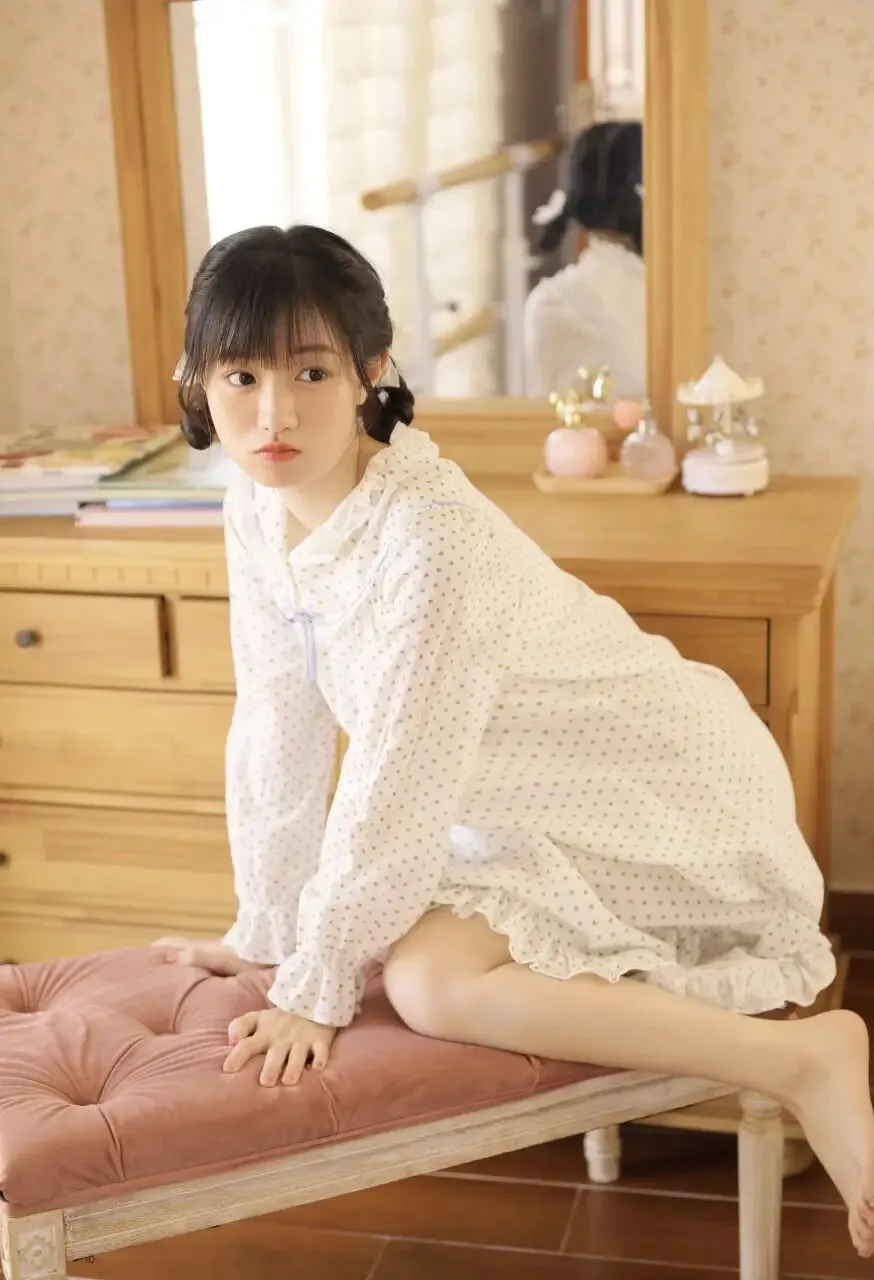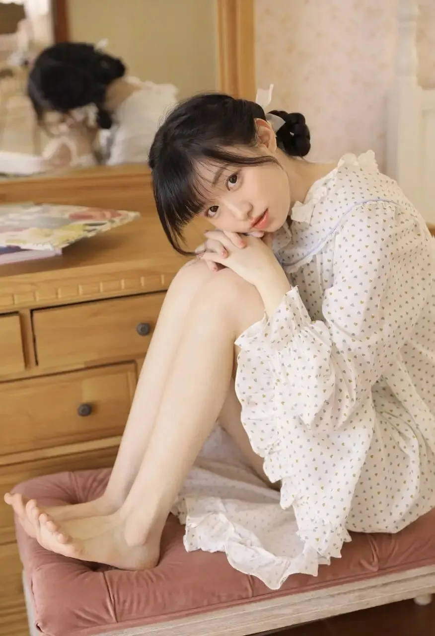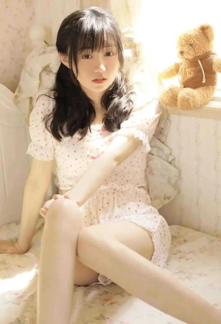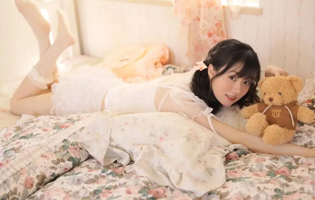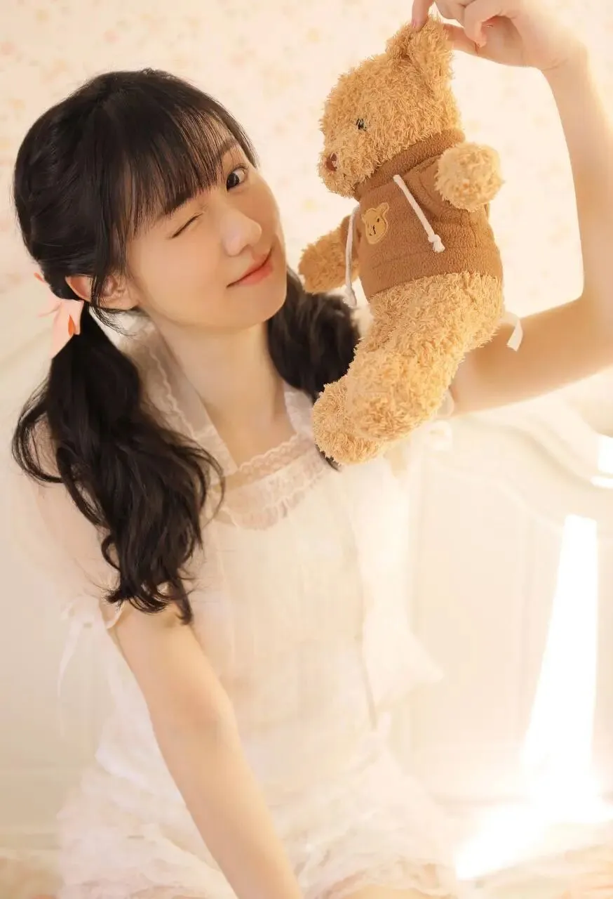 午后,当光线变得醇厚如蜜,她会抱起那只泰迪熊,或是将脸轻轻贴在它身上,或是举着它,自己则闭着眼,歪头露出一个心满意足的甜笑。那一刻,少女的烂漫与玩偶的无邪交织,构成一幅毫无杂质的快乐图景。房间的每个角落都盛放着这种静谧的愉悦——无论是她倚在抽屉柜旁,回眸时眼中沉静的温柔;还是她穿着荷叶边睡裙,指尖轻点眼睑下方,若有所思的恬淡模样。