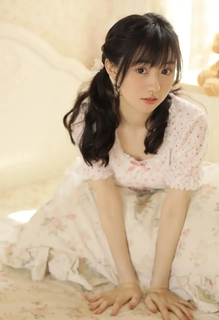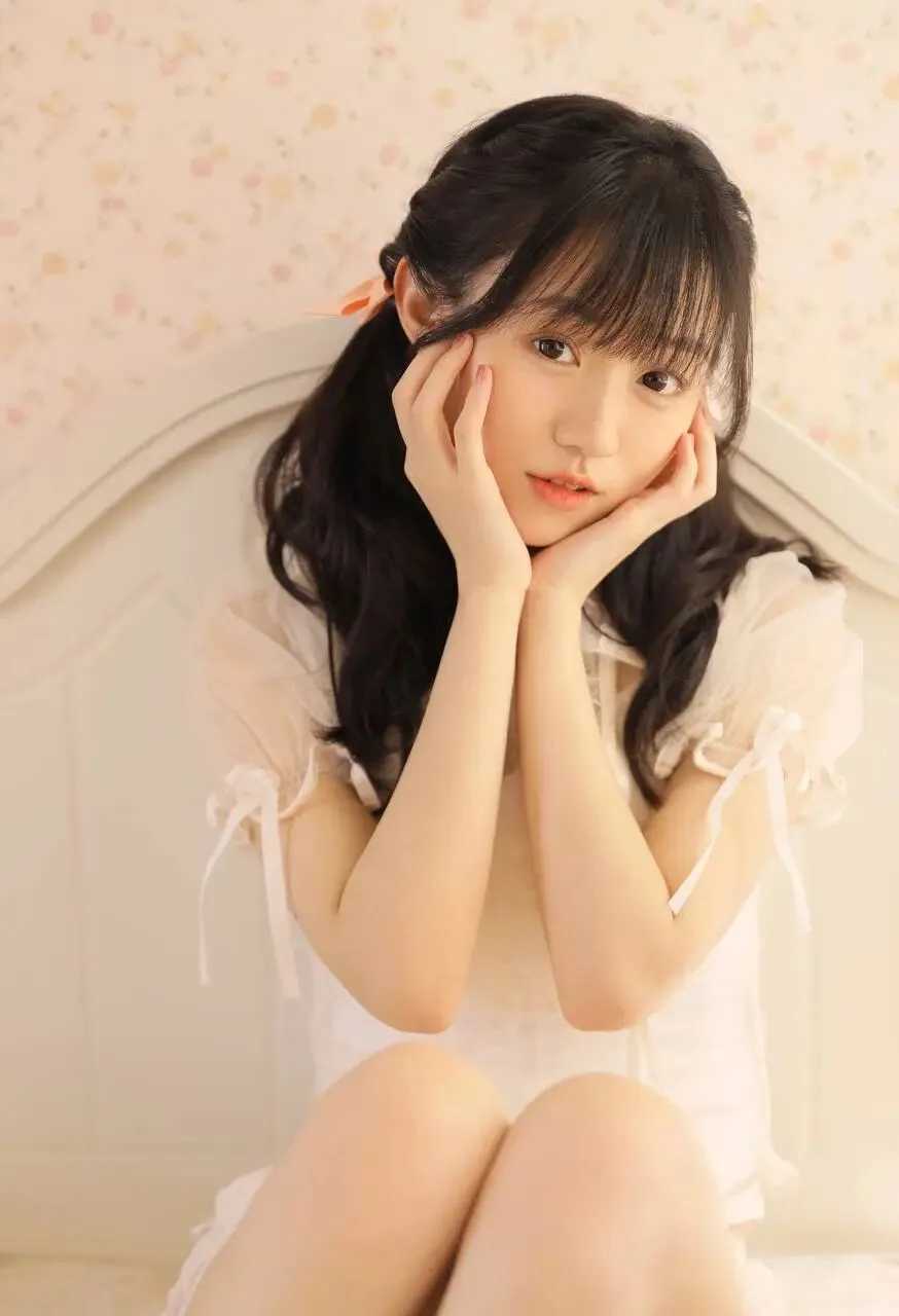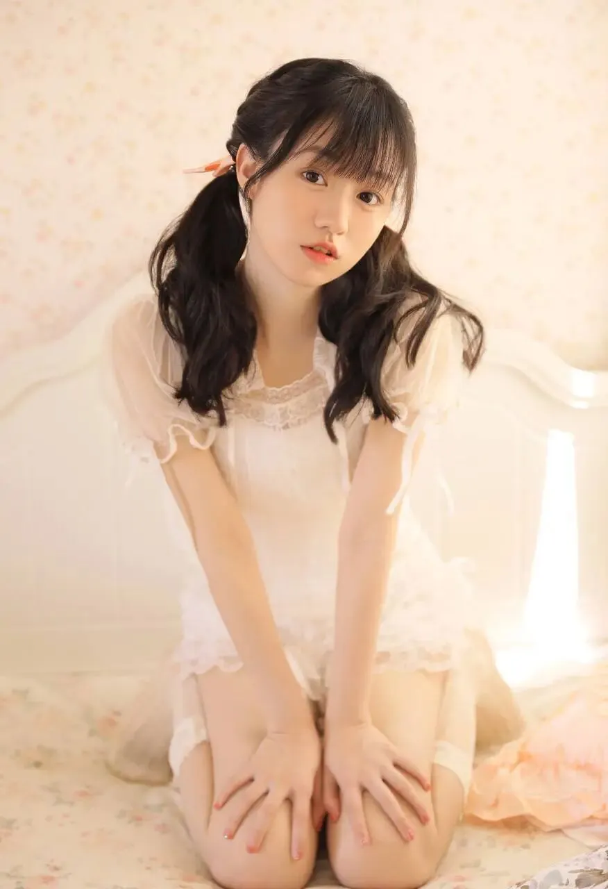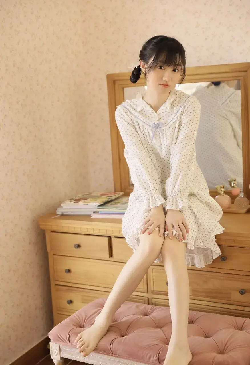 午后,当光线变得醇厚如蜜,她会抱起那只泰迪熊,或是将脸轻轻贴在它身上,或是举着它,自己则闭着眼,歪头露出一个心满意足的甜笑。那一刻,少女的烂漫与玩偶的无邪交织,构成一幅毫无杂质的快乐图景。房间的每个角落都盛放着这种静谧的愉悦——无论是她倚在抽屉柜旁,回眸时眼中沉静的温柔;还是她穿着荷叶边睡裙,指尖轻点眼睑下方,若有所思的恬淡模样。