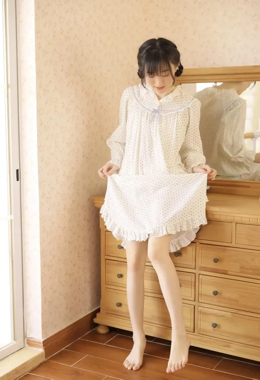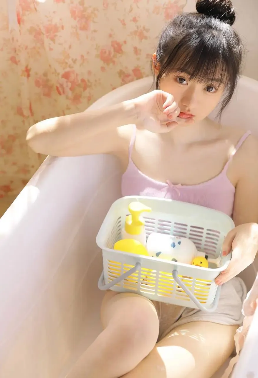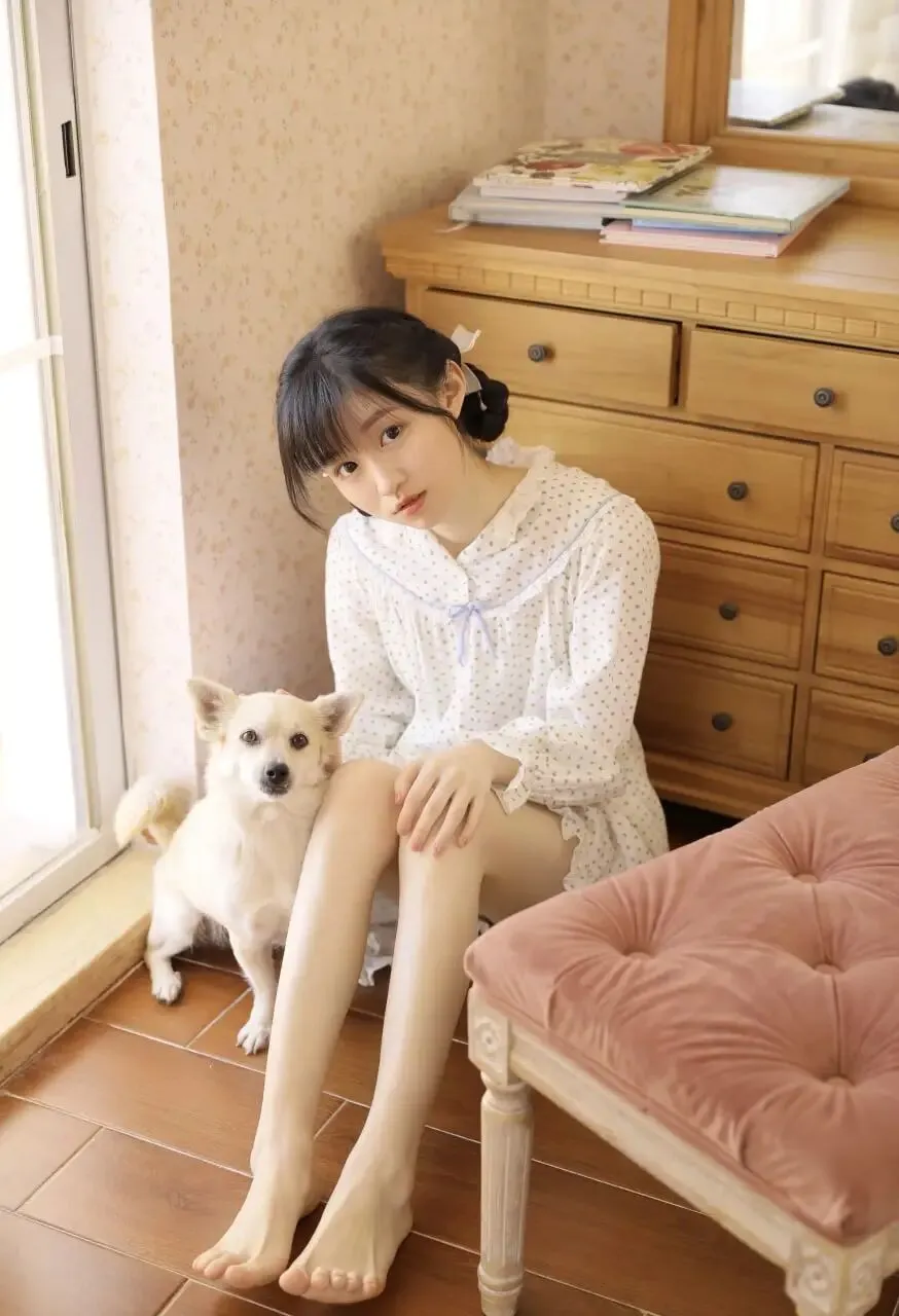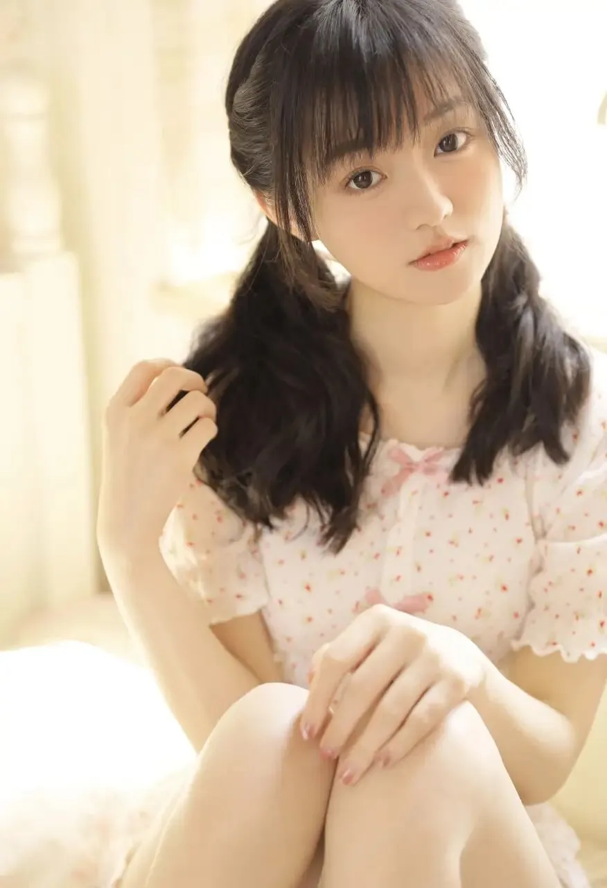 午后,当光线变得醇厚如蜜,她会抱起那只泰迪熊,或是将脸轻轻贴在它身上,或是举着它,自己则闭着眼,歪头露出一个心满意足的甜笑。那一刻,少女的烂漫与玩偶的无邪交织,构成一幅毫无杂质的快乐图景。房间的每个角落都盛放着这种静谧的愉悦——无论是她倚在抽屉柜旁,回眸时眼中沉静的温柔;还是她穿着荷叶边睡裙,指尖轻点眼睑下方,若有所思的恬淡模样。