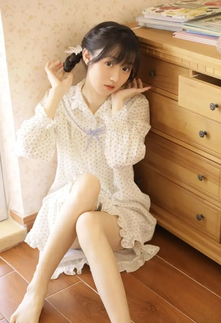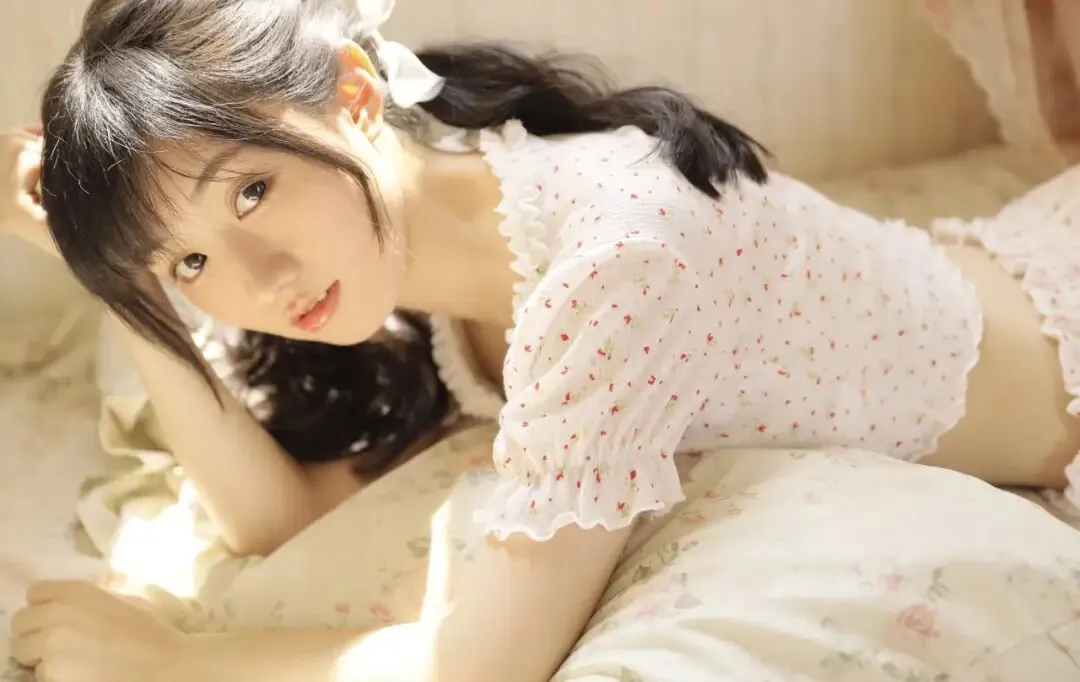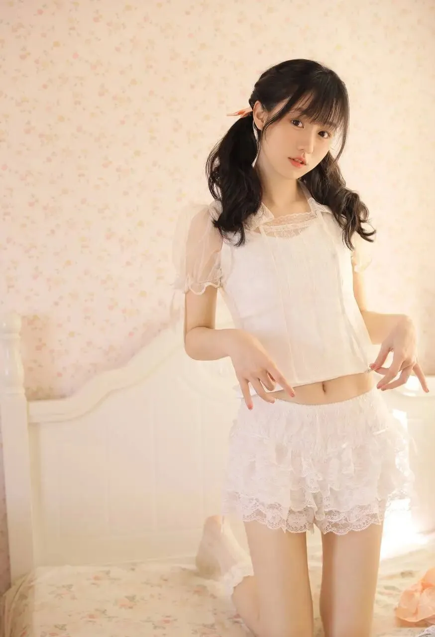 她喜欢在这样的光里流连。有时,她会换上那条领口系着蓝色蝴蝶结的白色波点裙,坐在木质五斗柜旁的地板上,背靠着柜身,指尖抚过书页上印着的黄叶脉络,神情专注得仿佛能听见植物生长的秘语。阳光从她身侧的格子窗斜射而入,照亮她侧脸柔和的线条,也照亮发辫上那枚白色小发卡的微光。有时,她又会随意地跪坐在铺着同样碎花床单的榻上,穿着那身有蕾丝花边的白色短衫短裤,调皮地向镜头张开五指,眼神清澈,笑容里带着一丝被宠溺的娇憨。光影在她伸展的指尖跳跃,仿佛能捕捉到流淌的时光。