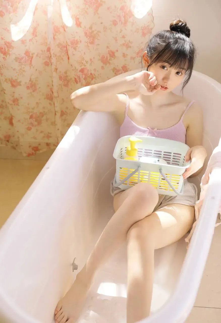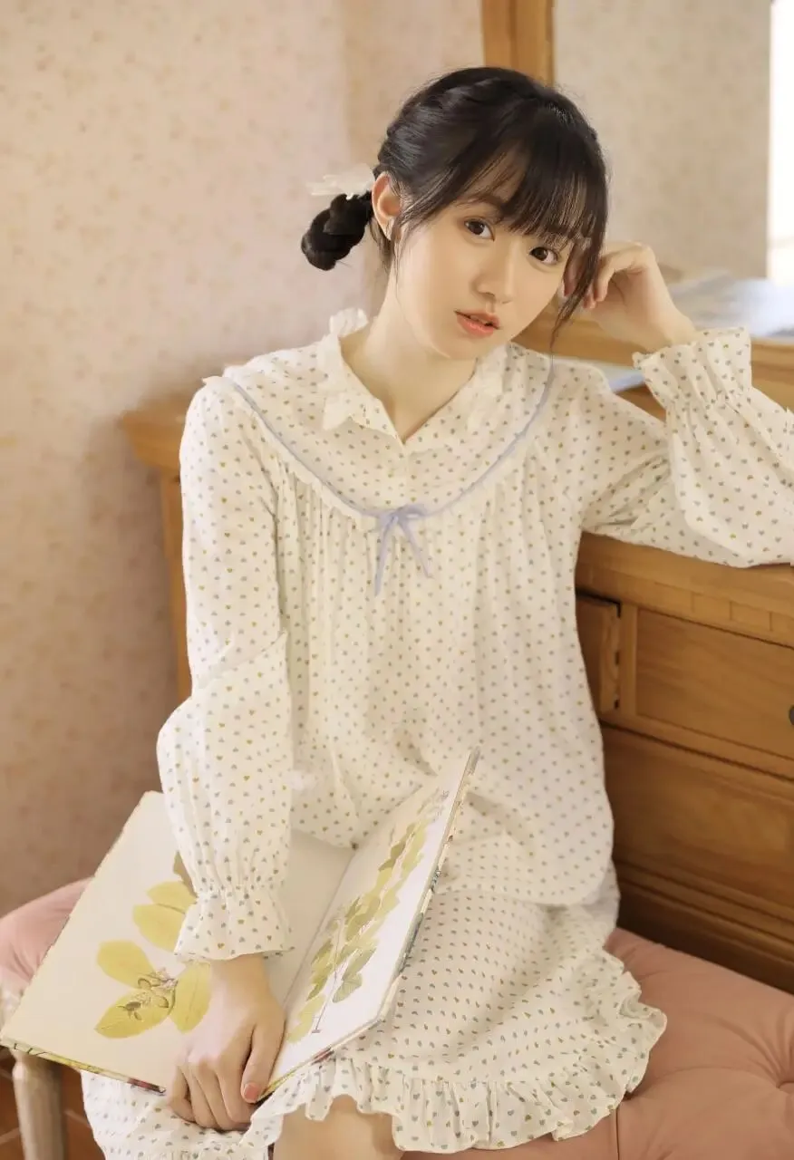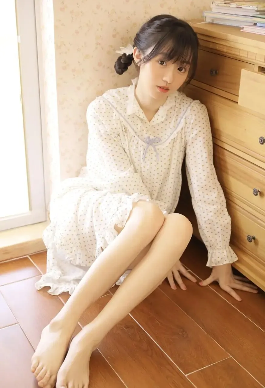她喜欢在这样的光里流连。有时,她会换上那条领口系着蓝色蝴蝶结的白色波点裙,坐在木质五斗柜旁的地板上,背靠着柜身,指尖抚过书页上印着的黄叶脉络,神情专注得仿佛能听见植物生长的秘语。阳光从她身侧的格子窗斜射而入,照亮她侧脸柔和的线条,也照亮发辫上那枚白色小发卡的微光。有时,她又会随意地跪坐在铺着同样碎花床单的榻上,穿着那身有蕾丝花边的白色短衫短裤,调皮地向镜头张开五指,眼神清澈,笑容里带着一丝被宠溺的娇憨。光影在她伸展的指尖跳跃,仿佛能捕捉到流淌的时光。