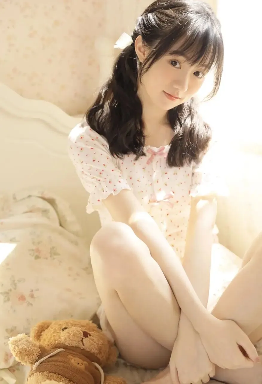 空气里飘浮着微尘,在光束中缓缓旋舞,仿若时光也有了可见的形体。她终于动了动,纤细的手指无意识地触到身旁那只棕色泰迪熊柔软的绒毛,嘴角便勾起一丝半梦半醒的笑。坐起身时,浅粉色碎花的棉质睡衣衬得她肤色愈发莹润,胸前的小小蝴蝶结也随之轻轻一颤。赤足踏在微凉的地板上,她推开窗,让更丰沛的光与清新的风一同涌入,瞬间充盈了整个房间。墙壁上淡粉的小花壁纸、床头柜上摊开的书页,都在这光里苏醒过来,色彩变得鲜活而明亮。