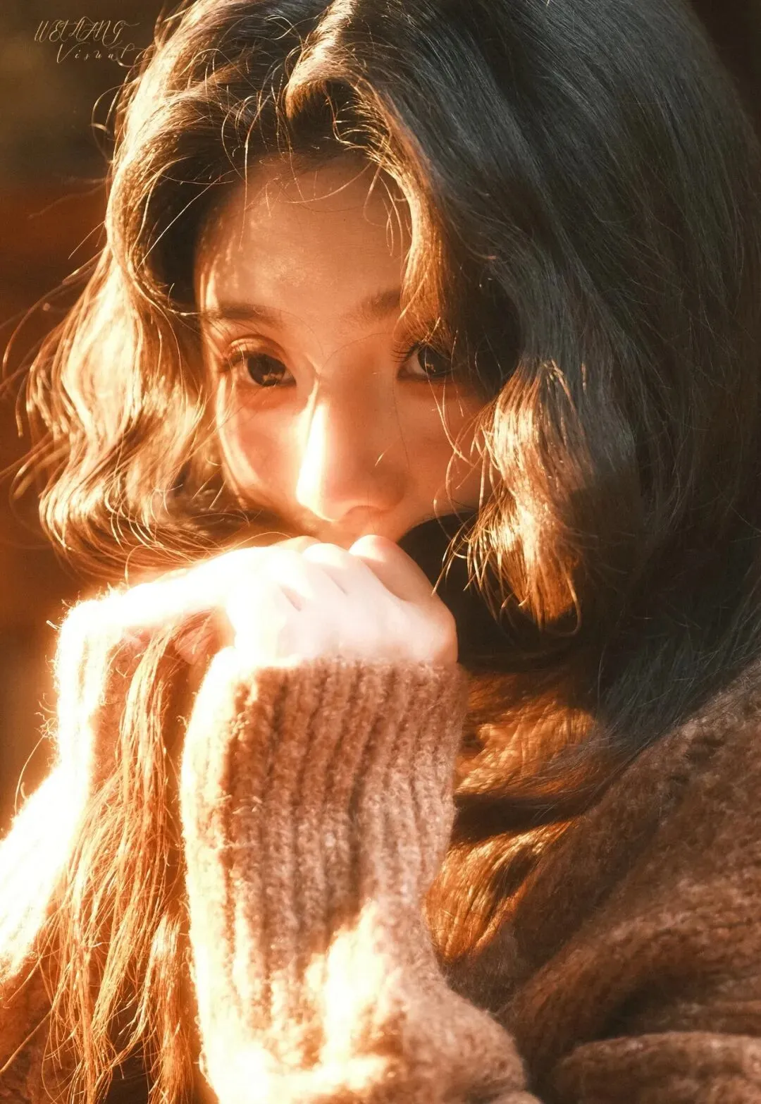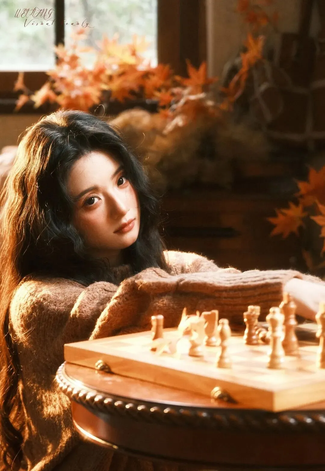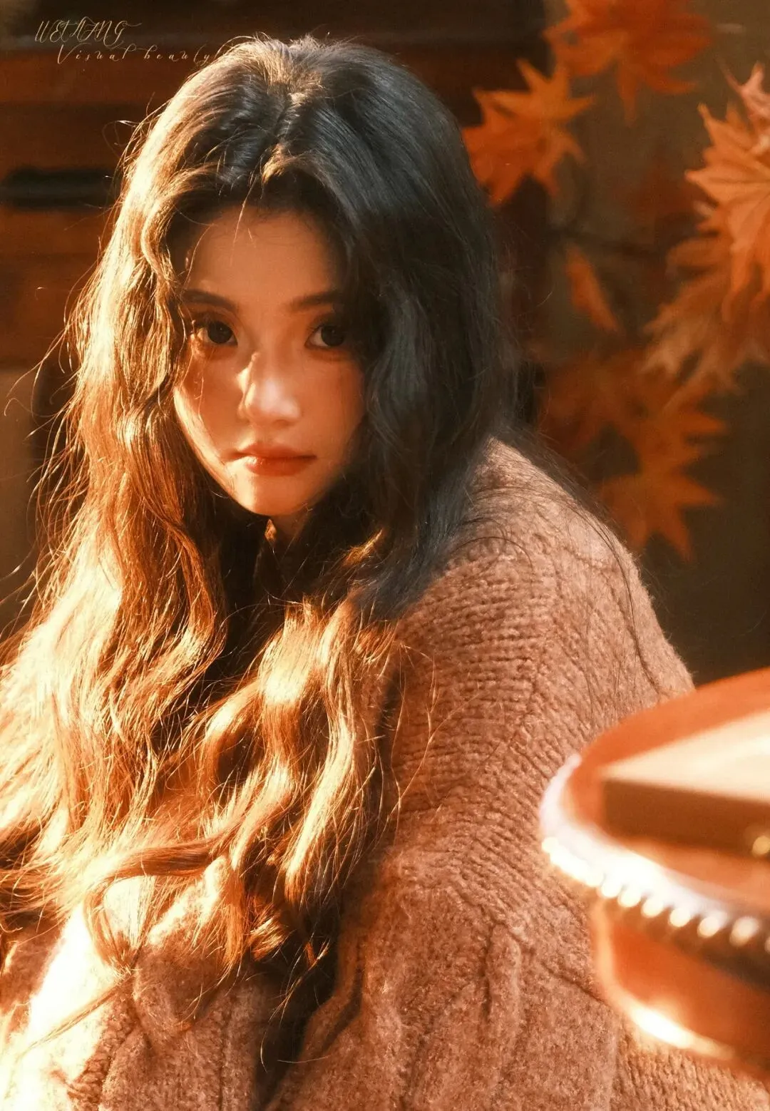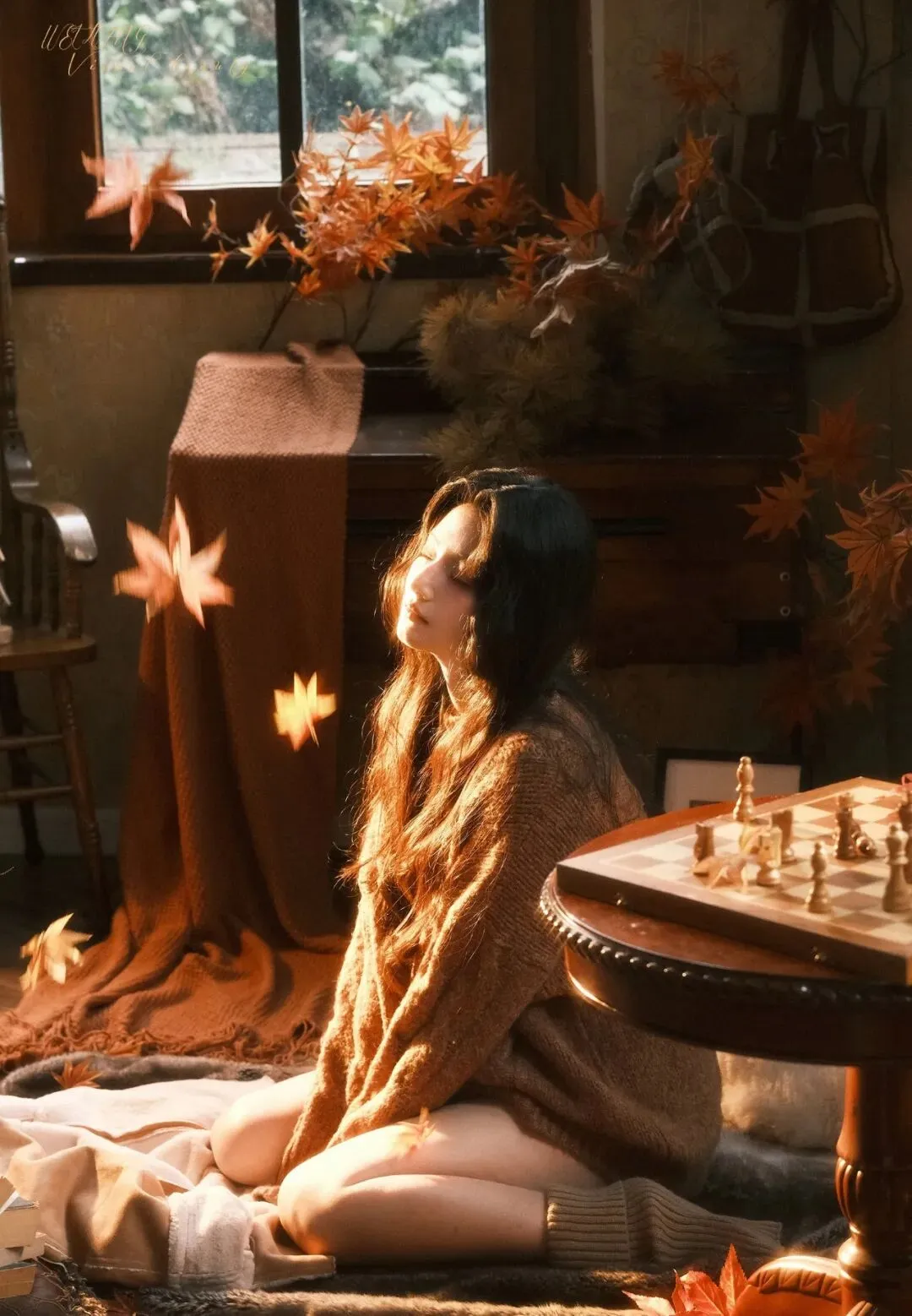 背景中,几片橙红色的枫叶挂在墙上,为整个画面增添了一抹浓郁的秋意。墙上的相框里,装裱着一片黄色的枫叶,与周围的秋叶相呼应,营造出一种温馨而浪漫的氛围。阳光透过窗户,洒在女子身上和周围的物品上,形成一片片光斑,给整个场景增添了一份温暖和宁静。