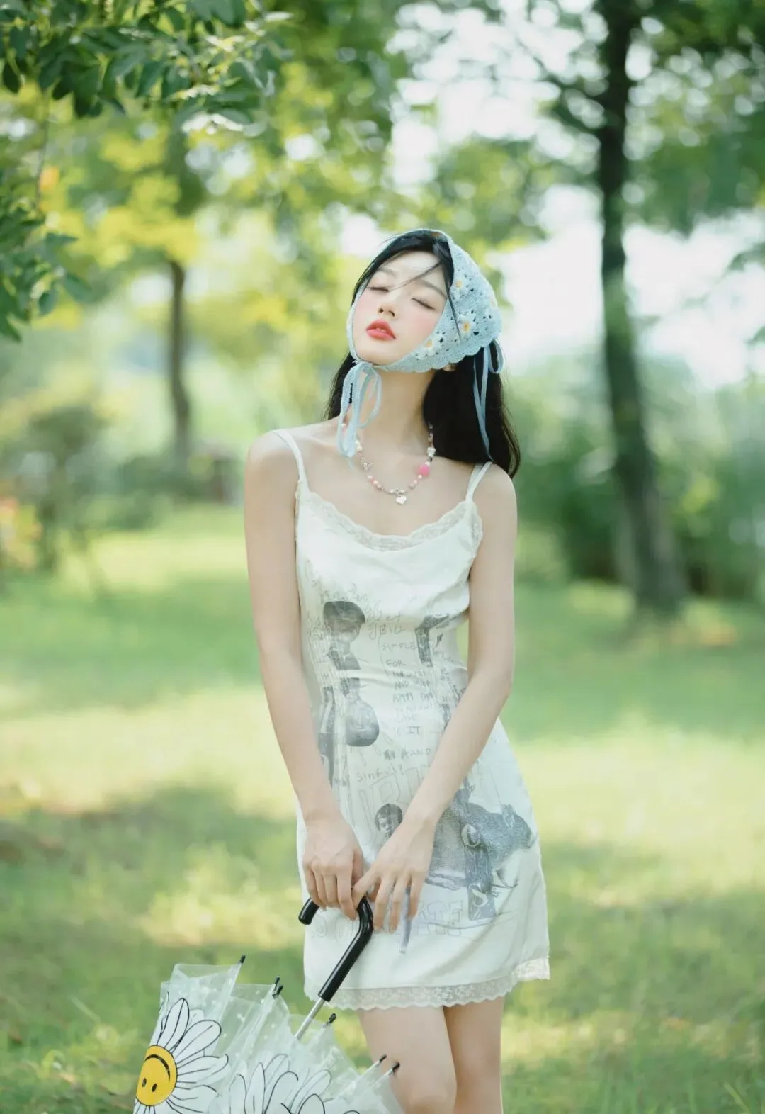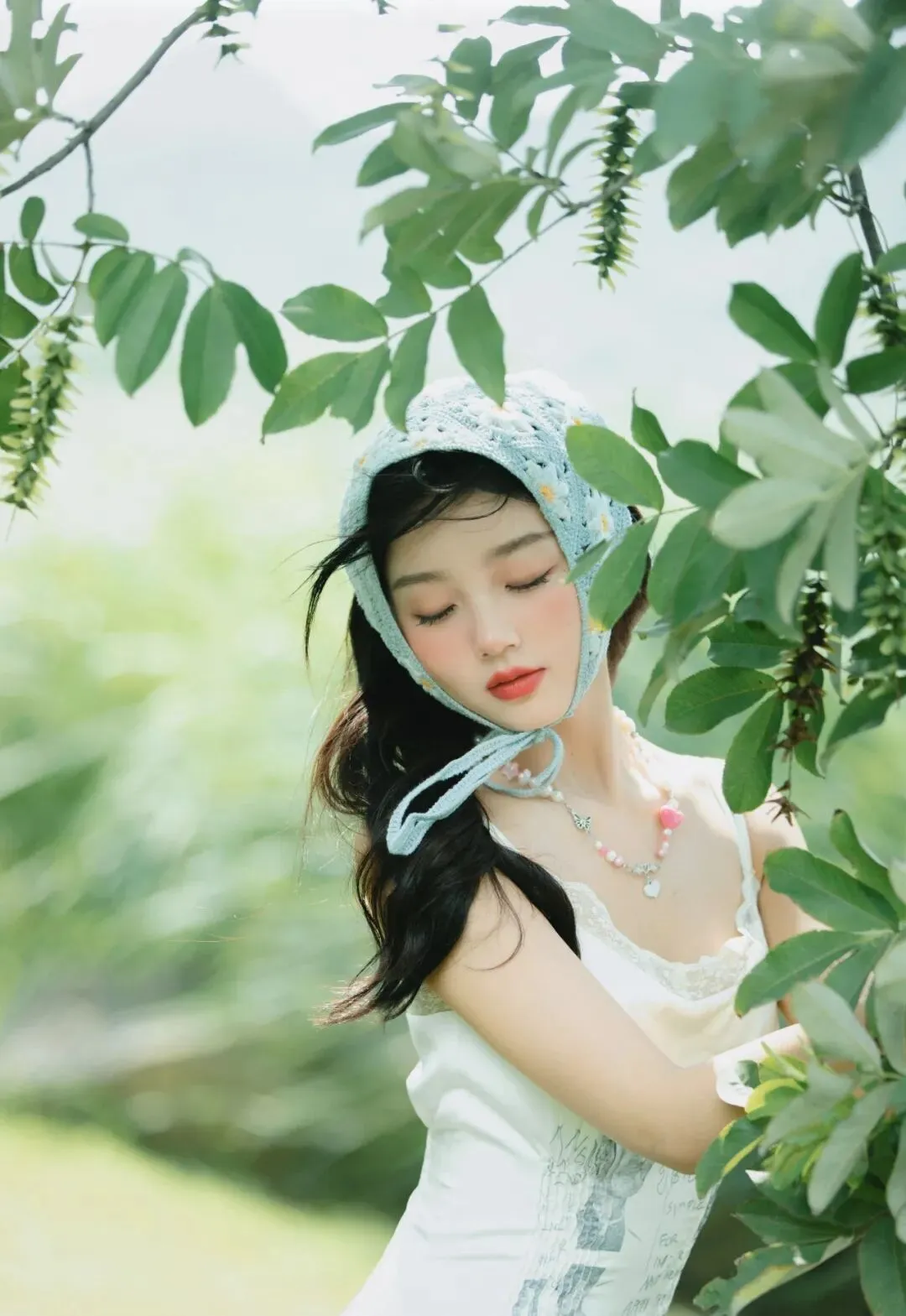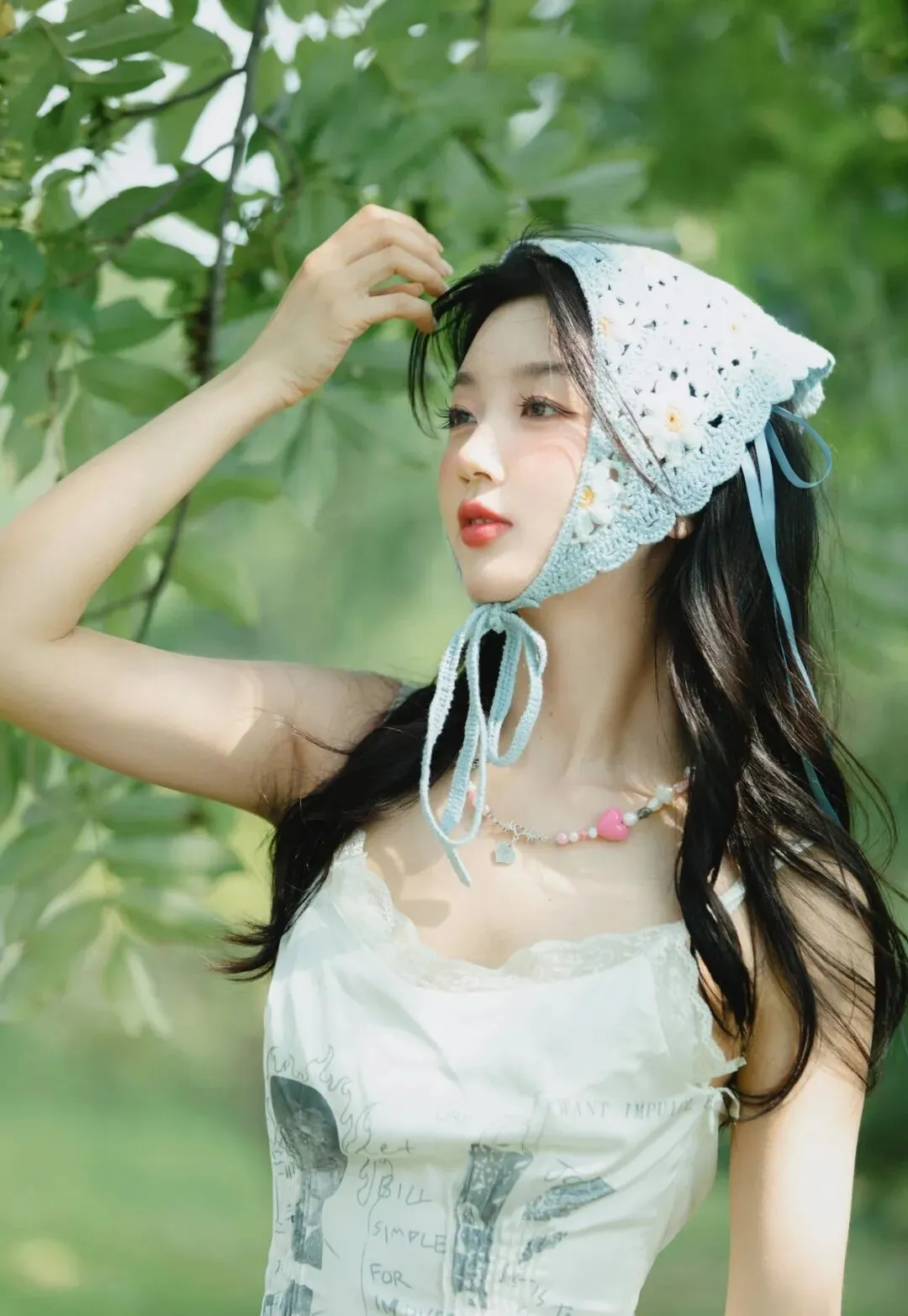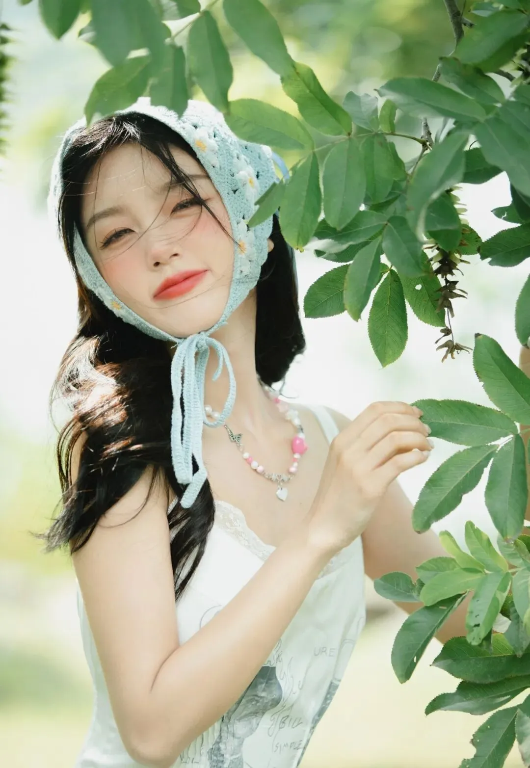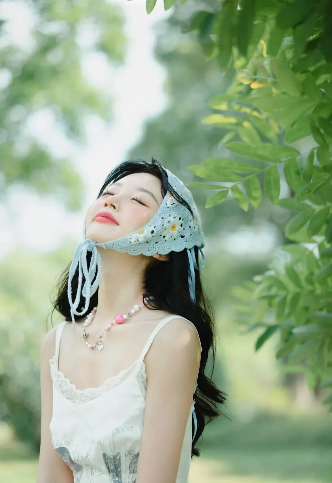 她头戴一顶浅蓝色的针织头巾,头巾上有着细密的孔洞,透着一种质朴的手工质感。头巾的系带自然垂落,在微风中轻轻摇曳,为整体造型增添了一份灵动与俏皮。脖子上佩戴着一串由粉色珠子串成的项链,粉色的柔和与白色的纯净、浅蓝色的清新相互映衬,显得格外甜美可爱。