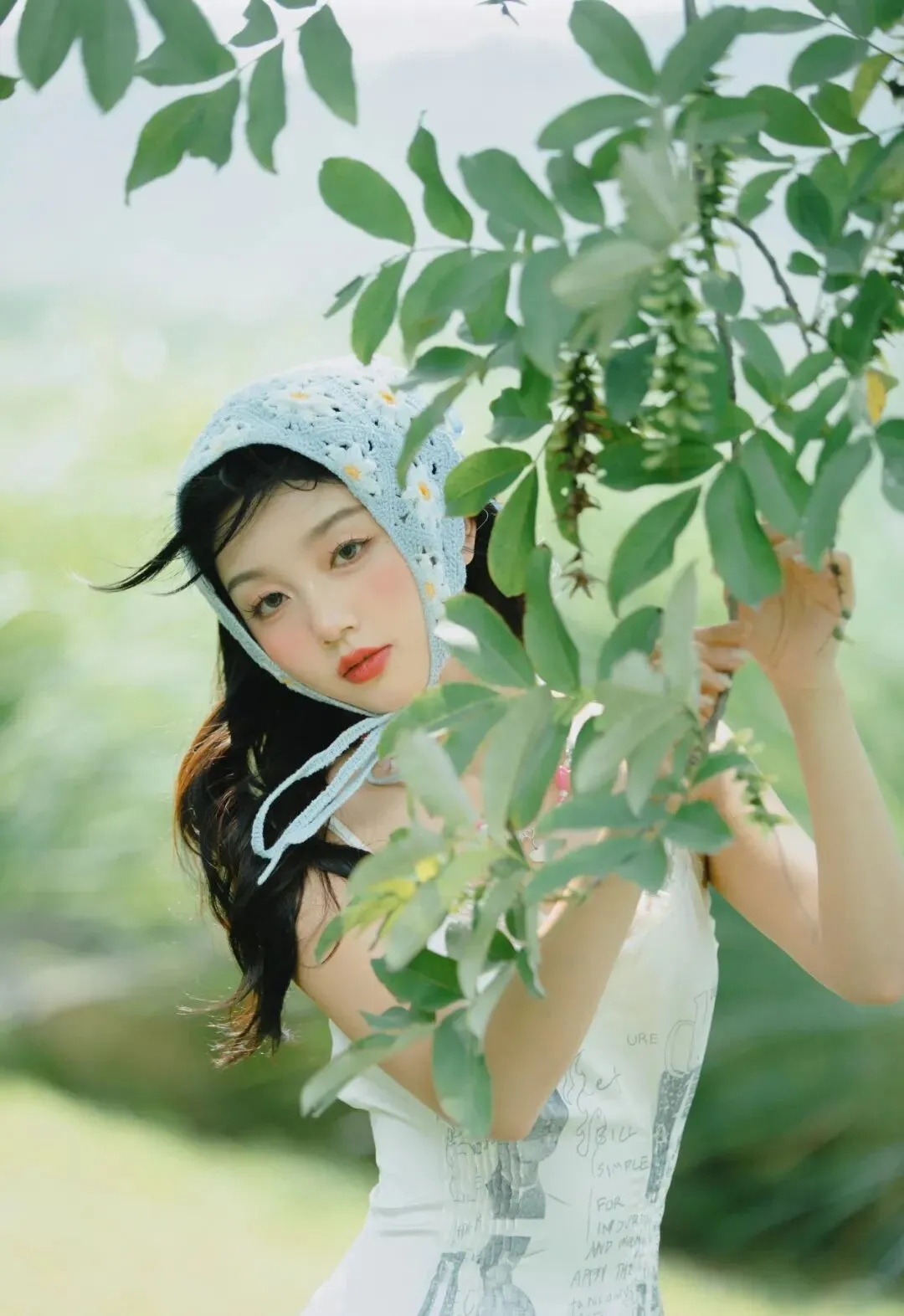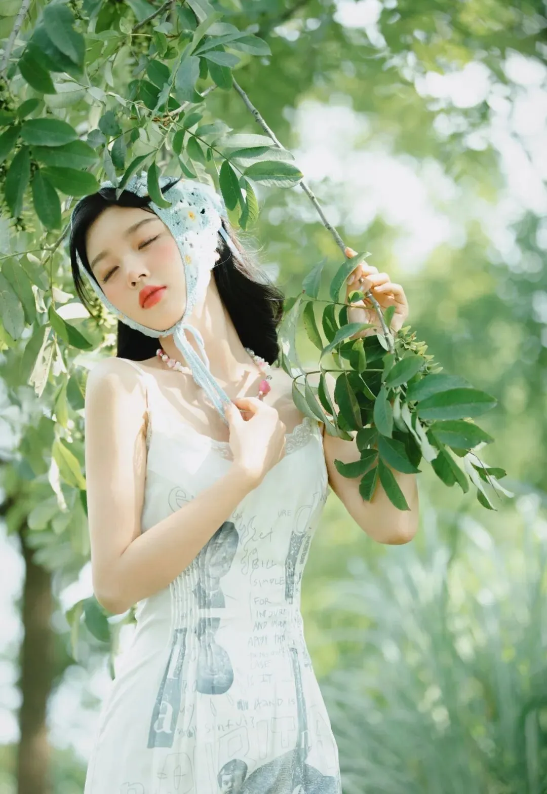 此刻,她站在繁茂的绿树之下,双手轻轻握住一根树枝,枝头满是翠绿的叶子,在阳光的照耀下闪烁着生命的光芒。她双眼轻闭,神情放松而惬意,仿佛在享受着这片刻的宁静与美好。阳光透过树叶的缝隙洒在她的身上,形成一片片斑驳的光影,如同大自然赋予的梦幻滤镜,让整个画面充满了诗意与浪漫。