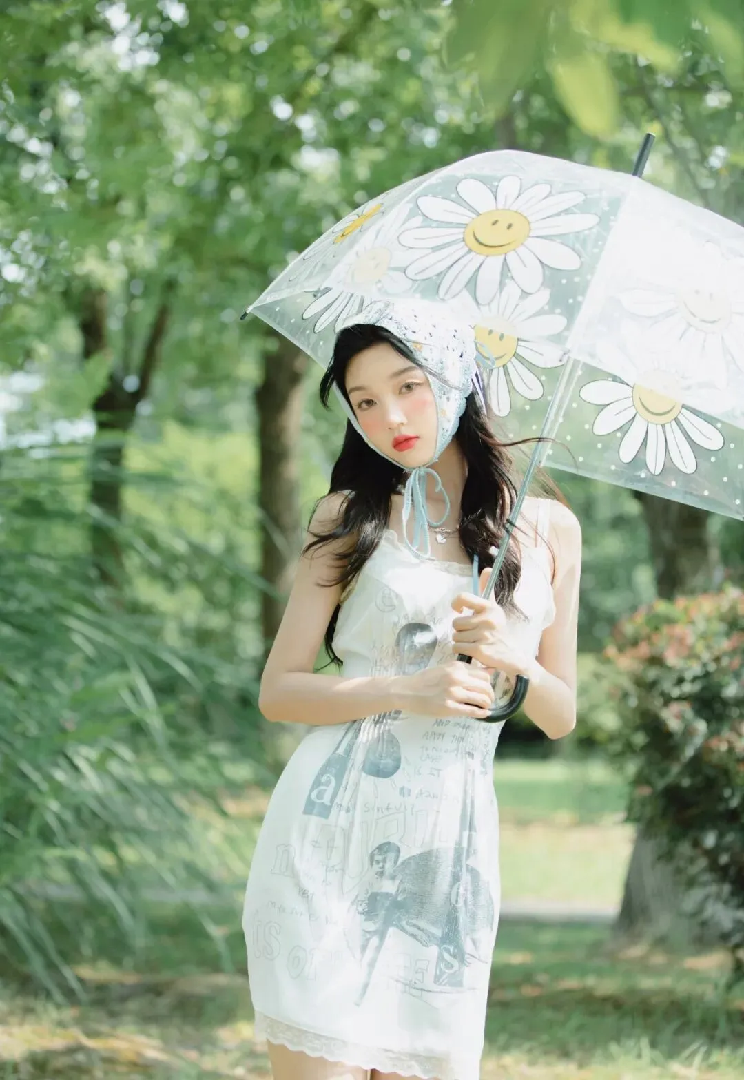 女子身着一件白色吊带长裙,裙子上印着灰色的字母和图案,像是随意涂抹的艺术笔触,又似承载着无数故事的神秘密码。白色的纯净与灰色的低调相互交融,营造出一种简约而不失个性的氛围。吊带的设计露出她光洁的肩膀和精致的锁骨,增添了几分性感与柔美。裙身轻盈飘逸,随着微风轻轻摆动,仿佛在与周围的绿叶共舞。