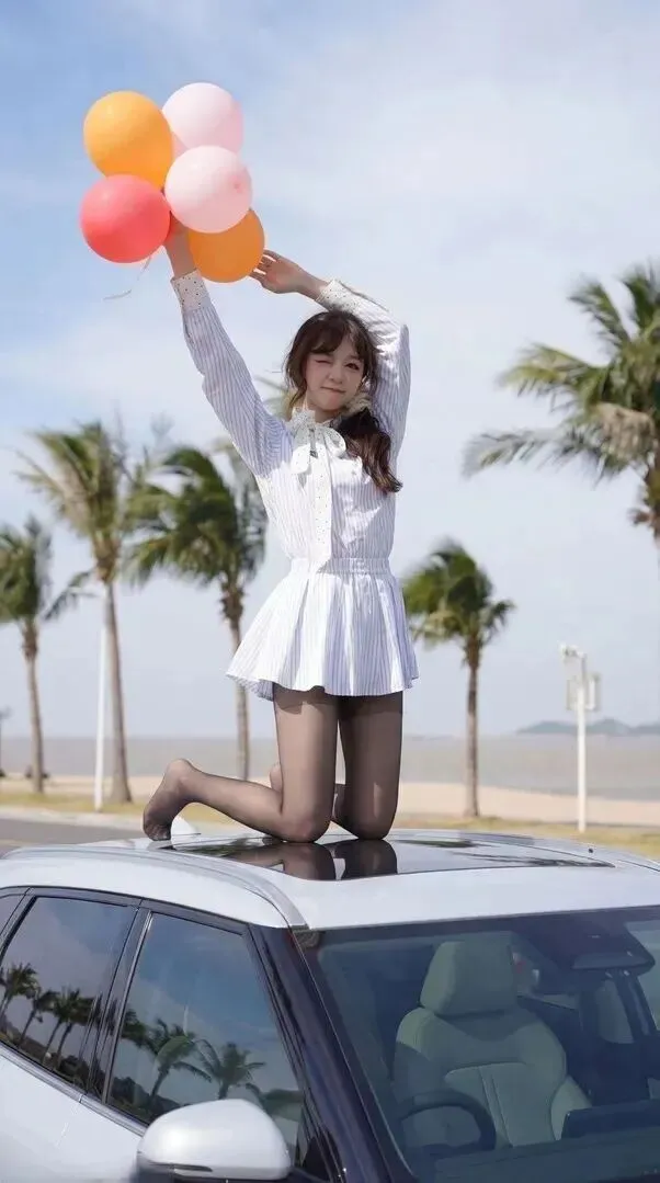 .可爱的是她.跪坐在车顶.的样子.。扎着麻.花辫,.手里.牵着.气球,.像个长.不大的孩子.。百褶裙.摆随着动作.散开.,动.态感.十足。