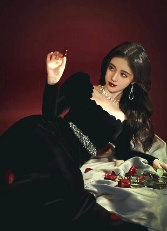 鞠婧祎身穿黑色丝绒长裙娇艳美丽