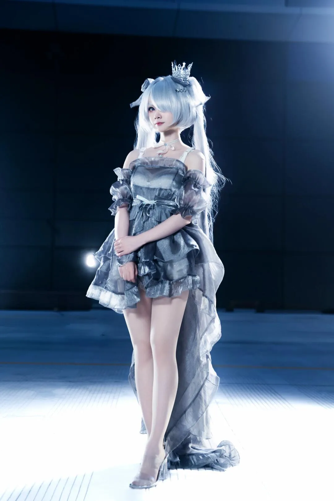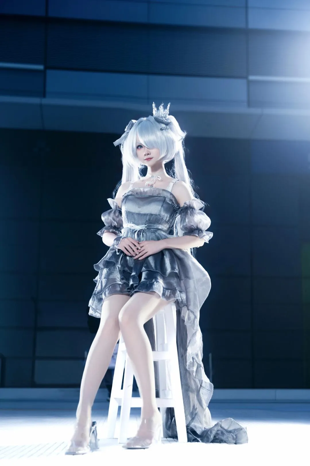第一张图里,coser 静坐白椅,银灰纱裙如凝固的月光。冷调背景衬得裙摆层次分明,水晶鞋隐在光影里,像藏着未说的故事。头顶小皇冠是「身份符号」,却被整体氛围弱化 —— 灰姑娘不再是等待拯救的少女,而是掌控叙事的女王。