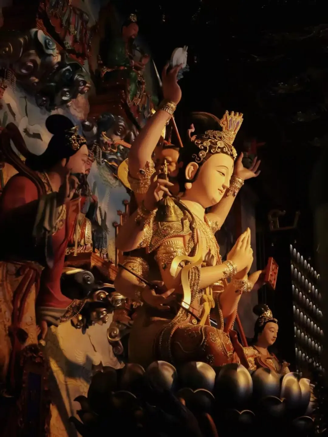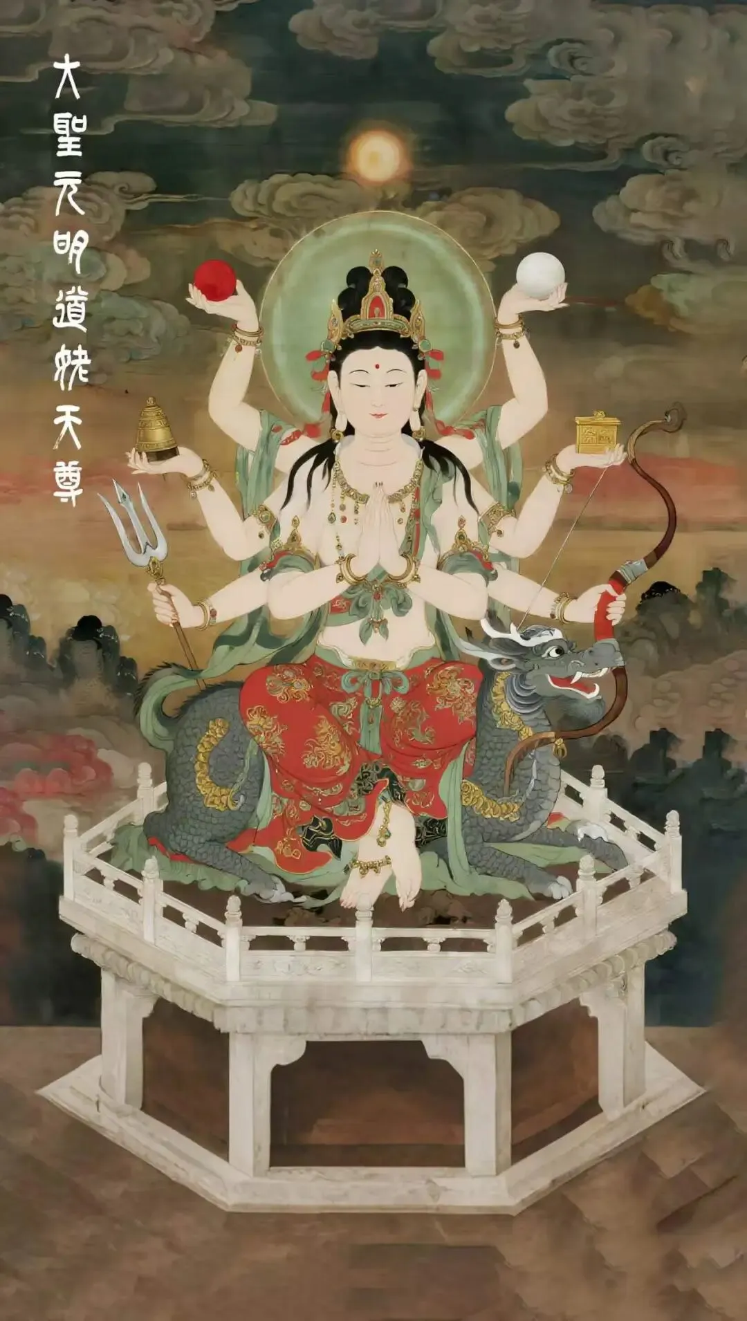 • 八条手臂:更是武装到牙齿,手里的法器件件是神器——托日月掌阴阳,拿宝杵降妖魔,摇法铃渡众生,握金印断善恶,妥妥的“神仙界多面手”,打得了怪,赐得了福,简直不要太全能。