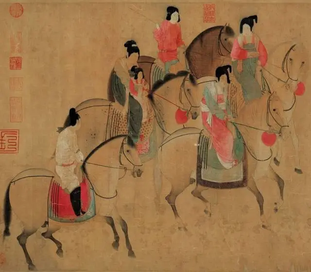 虢国夫人是唐玄宗的宠妃杨玉环的三姐,她的生活奢侈、豪华。画家在这方面的表现极为精到:红裙,青袄,白巾,绿鞍,骑鞍上金缕银丝精细的绣织,都显得十分富丽。