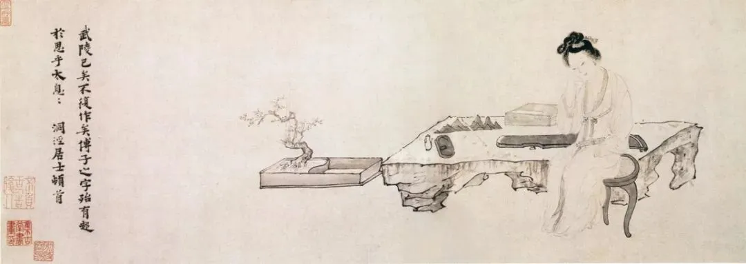 此图背景和陈设都很洗练,武陵春坐于石案前,手支颐,一手执卷,沉浸在哀惋不平的思绪中。