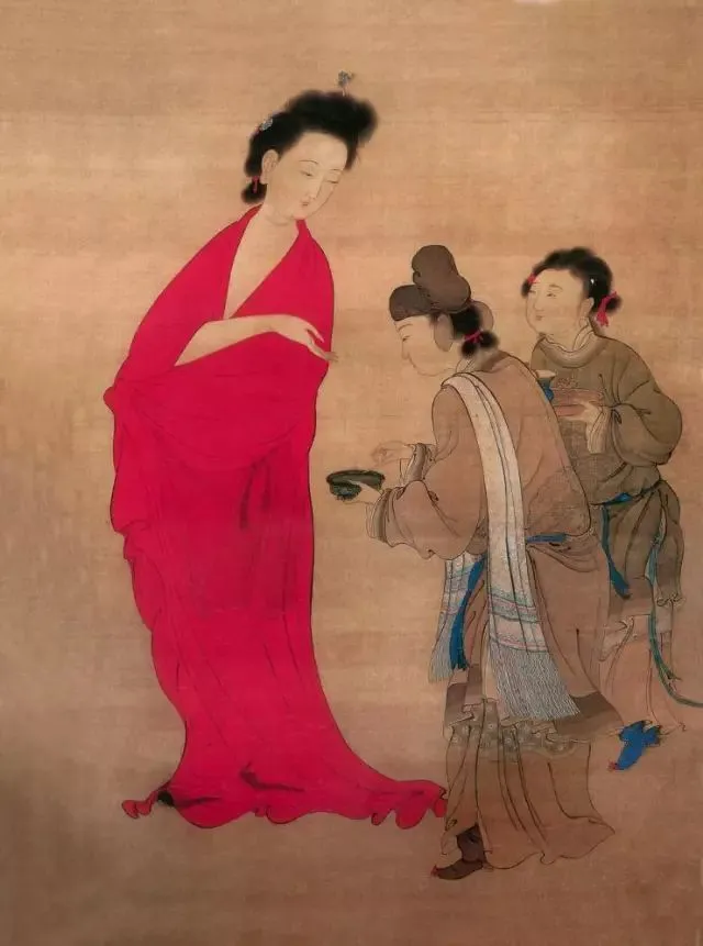 此图以杨贵妃出浴为题,杨贵妃的云鬓松挽,身披罗纱,两个小宫女端着香露,跟随其后。