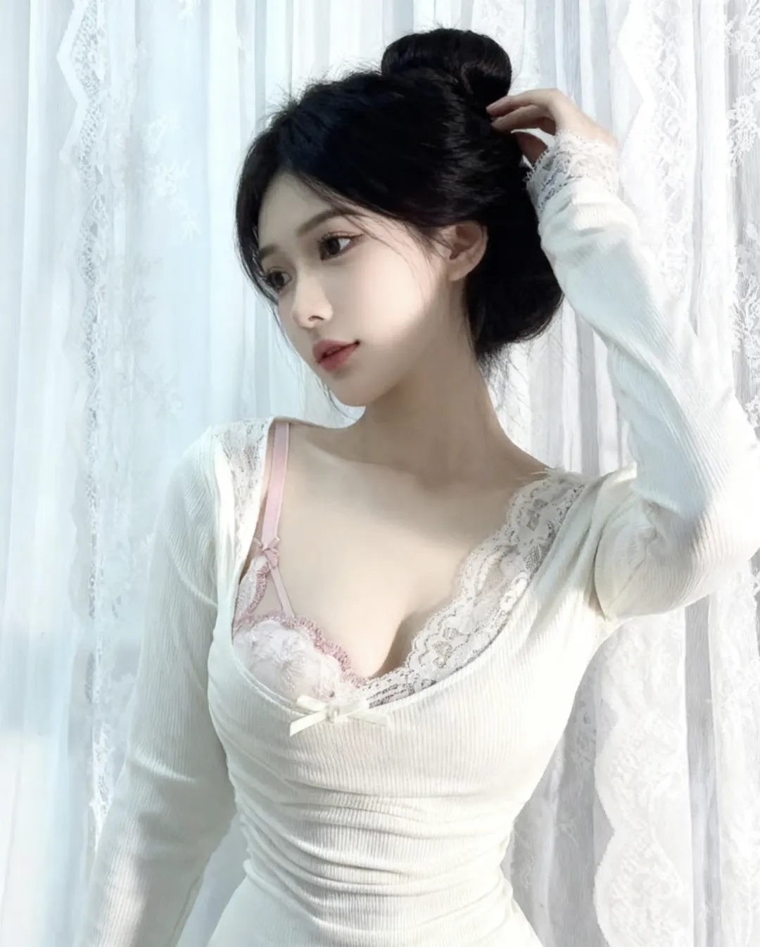 她倚在素白的蕾丝窗纱前,指尖轻轻勾着脑后挽起的黑发团子,腕间的蕾丝袖口服帖地滑到小臂,露出一截细腻如瓷的腕骨,像春日里刚冒头的笋尖,带着点不经意的娇柔。