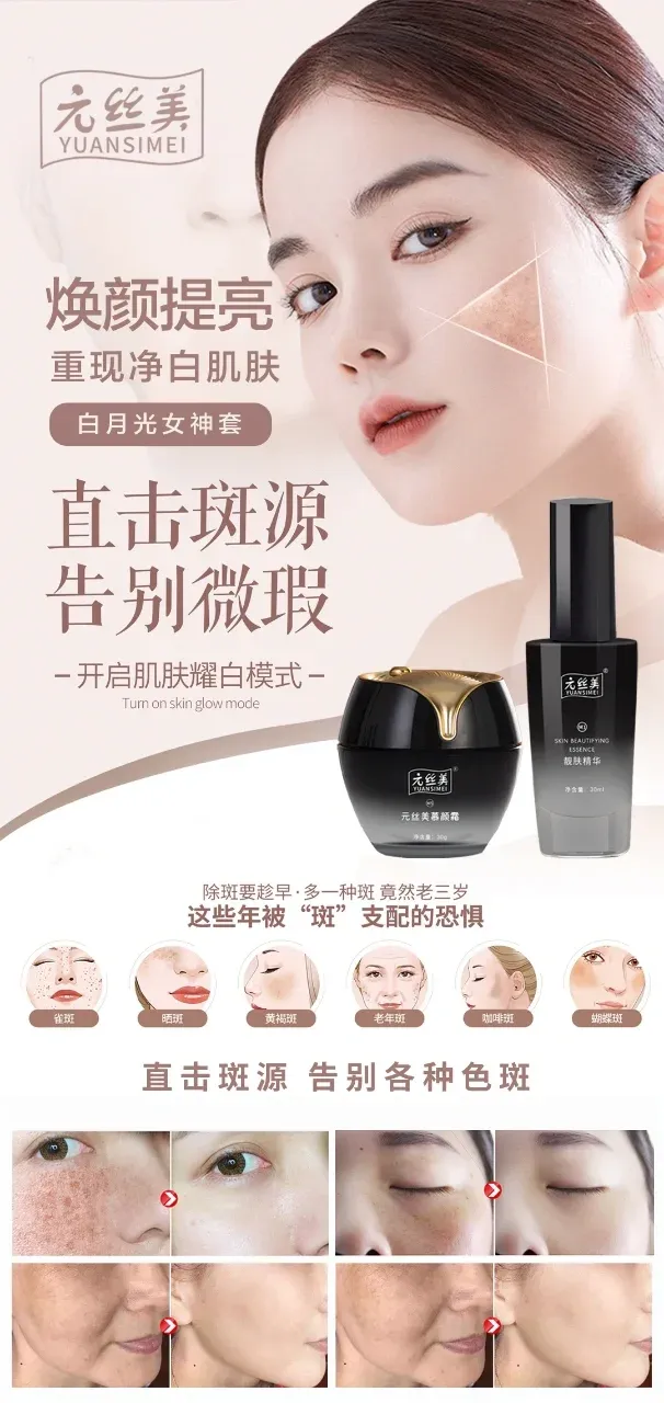 色斑、暗沉、毛孔粗大,多重肌肤问题困扰日常。我们专注淡斑修护,直击黑色素源头,瓦解顽固色斑。同时锁水抗衰,深层滋润粗糙肌肤,促进胶原生成,收紧毛孔。肌肤重现光泽细腻,告别瑕疵,绽放匀净亮白。