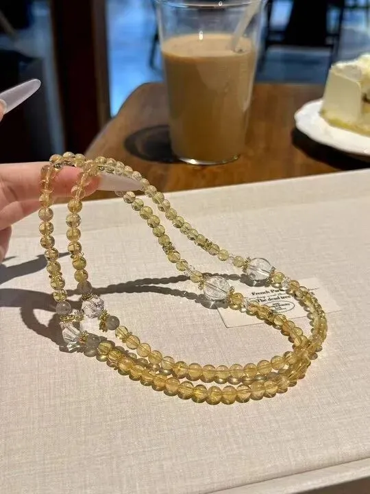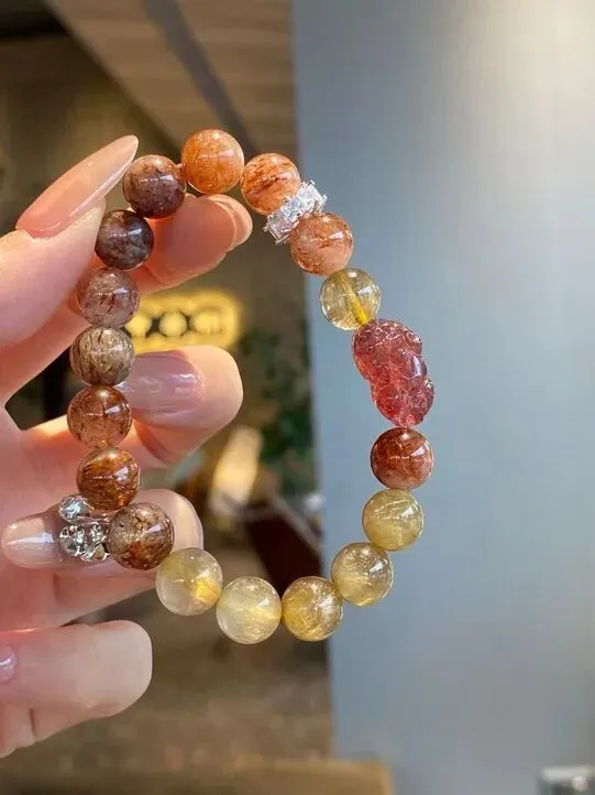 再惊艳的创意,也需要好材质来支撑。这款手链选用的全是天然水晶原石,每一颗都带着自然赋予的独特印记——有的五福水晶里藏着细碎的棉絮纹理,像把春日的薄雾封存在晶体里;有的发晶则带着清晰的发丝状包裹体,在光线下转动时,能折射出沉稳又高级的光泽。