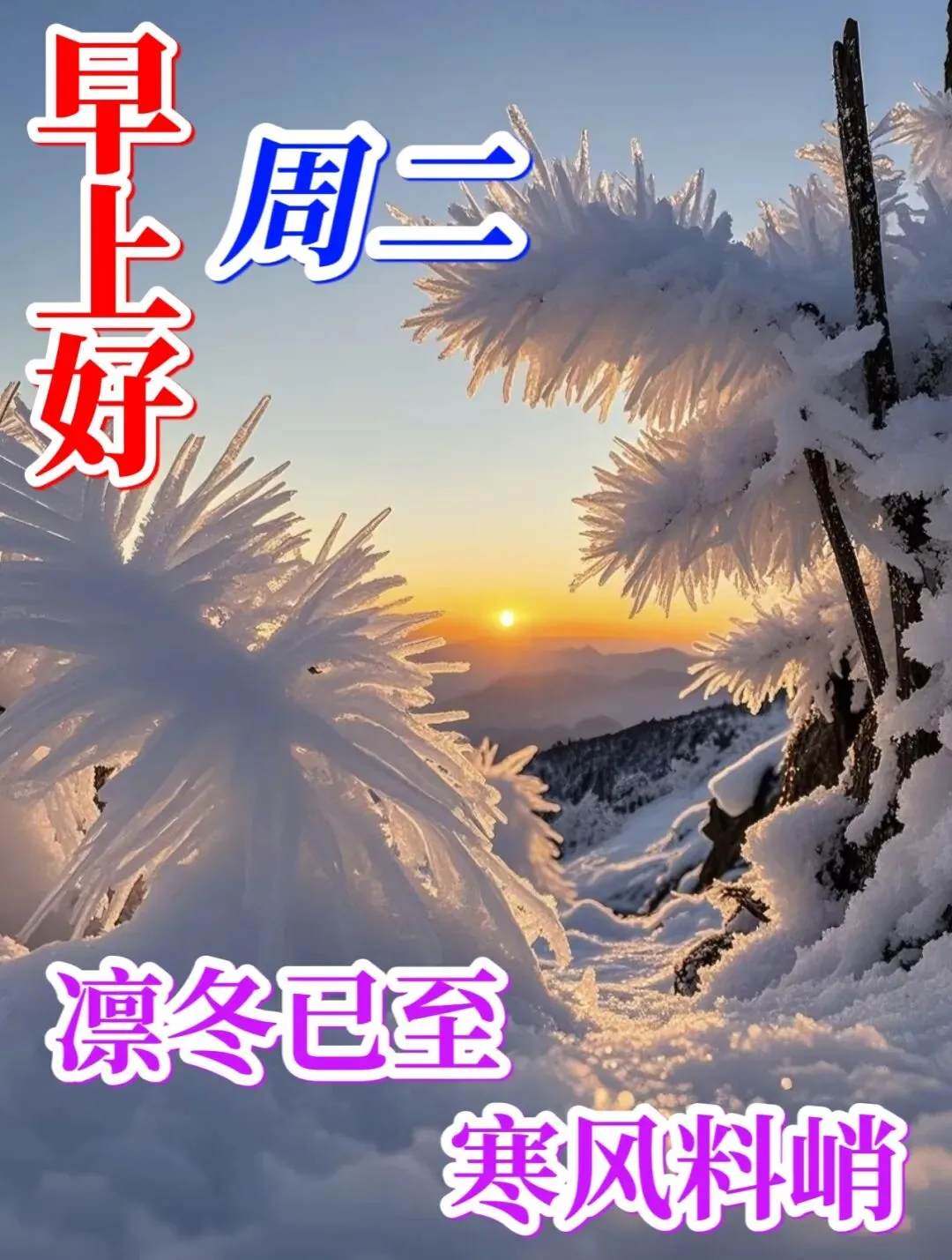 1、❄️早安呀!凛冬已至,寒风料峭🌬️,愿你晨起有暖粥暖胃,出门有厚衣御寒,日子朝朝暮暮皆顺遂,岁岁年年都安康,满心欢喜拥抱新一天✨!