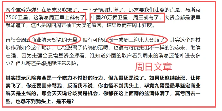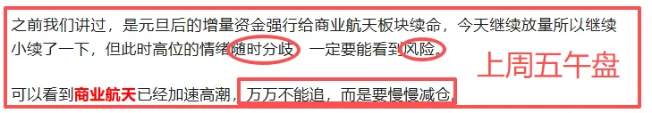 知道大家因为盘面的变化可能都很焦虑,所以九哥就直接给大家更新吧。商业航天开盘仅仅装了一下,就开始往下按,整个板块都崩,直接带崩了短线情绪和大盘,情绪本身就是被商业航天裹挟着上涨,那商业航天崩盘也会带跌。不过在九哥看来,不也是预料之中吗,我们从上周五就强调商业航天的风险了吧: