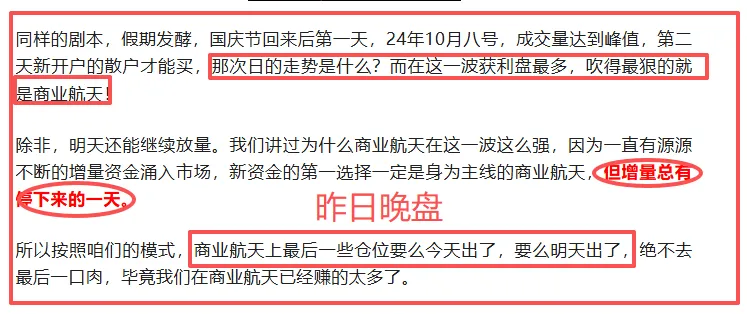 还有人问九哥,说他看早上也放量了,为啥不是按照九哥说的增量来了,还会选择去顶商业航天?请你们都睁大眼睛好好看看,早上的量是咋放出来的?是杀商业航天放出来的恐慌量,不是增量!昨晚直播的时候我还给大家讲过,我说3.64万亿不是终点,还有更高!为什么?因为商业航天里面获利盘太多,很多个股是加速的,大分歧杀下来,甚至有可能爆出4万亿的量,是不是昨晚直播原话?