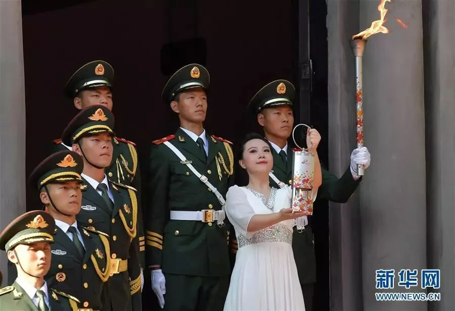 8月1日,采火使者方铭璐(前右)在展示圣火火种。新华社记者彭昭之摄