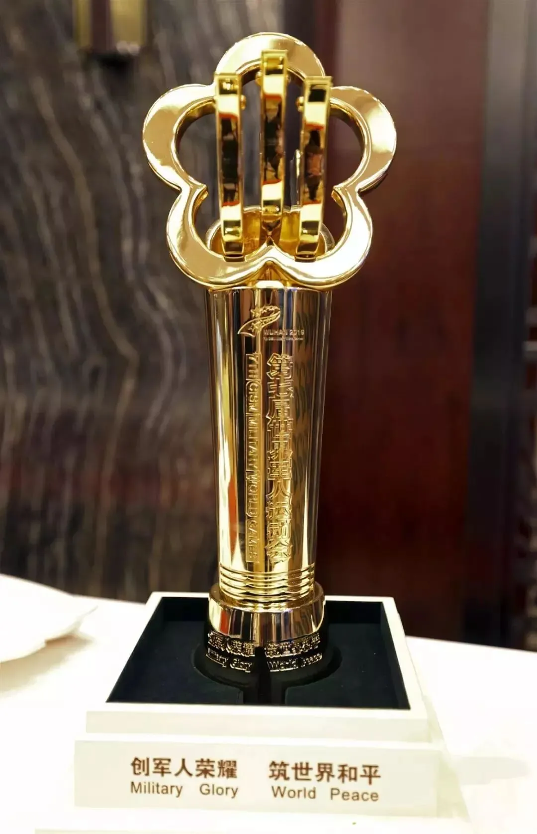 军运会奖杯名为“腾飞”,以梅花、抽象的和平鸽为设计主元素,与军运会会徽的数字“7”、跑道、祥云图形组合构成。一飞冲天的和平鸽造型,既体现“共筑世界和平”之意,也寓意运动员拼搏、向上,再创世界军运会佳绩。