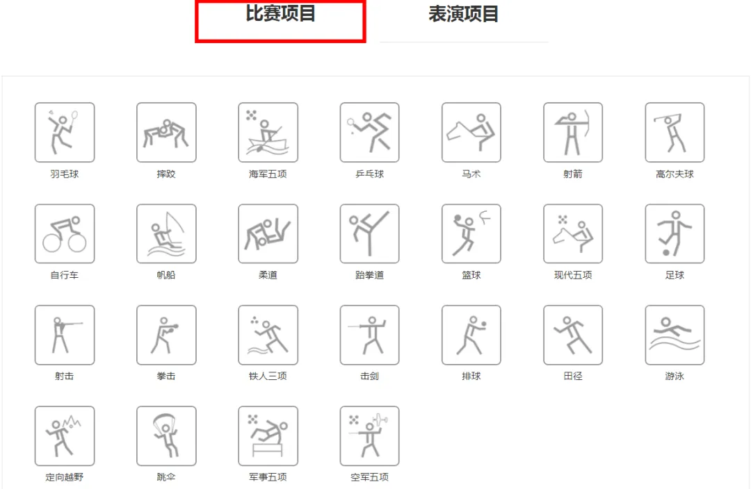 羽毛球、摔跤、海军五项、乒乓球、马术、射箭、高尔夫球、自行车、帆船、柔道、跆拳道、篮球、现代五项、足球、射击、拳击、铁人三项、击剑、排球、田径、游泳、定向越野、跳伞、军事五项、空军五项。