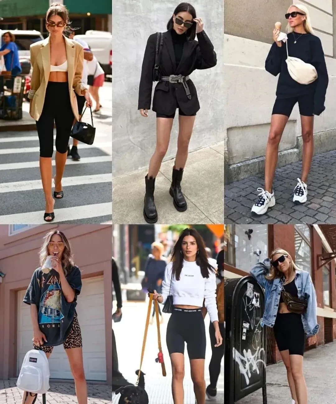 这种「Cycle Shorts」(或是Bike Shorts)通常是弹性纤维制成的高腰短裤,因其聚拢腰腹且勾勒臀线的效果,以及可以无缝切换工作与健身的便捷性,成为女性出街的一种新选择。