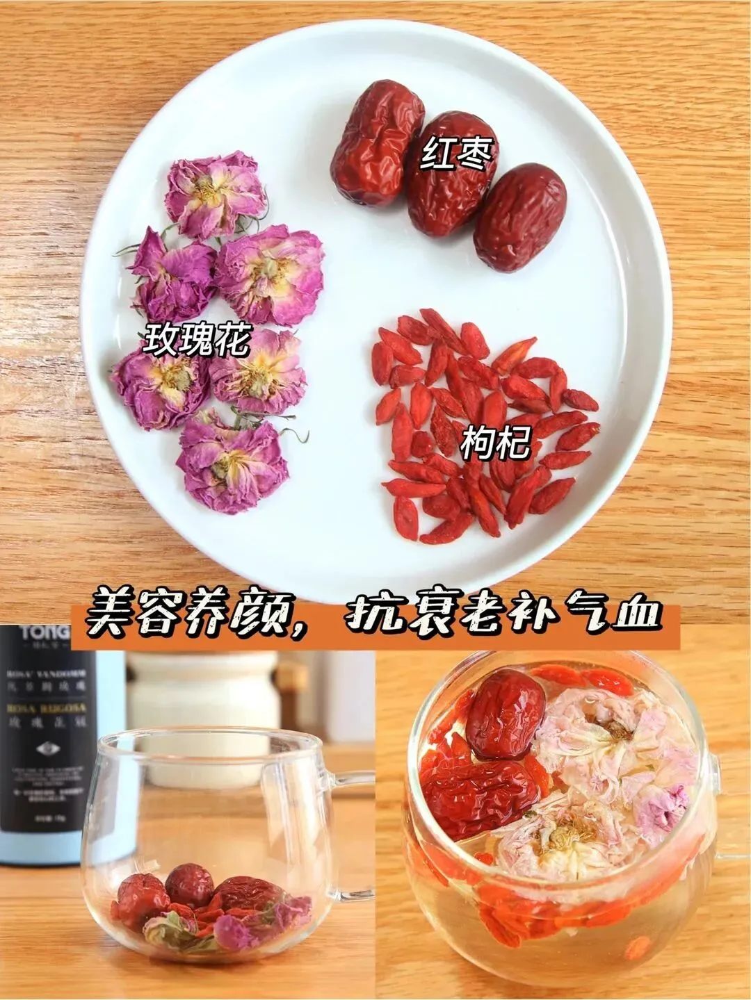 .可是经.典的“老三样”了!红枣.和枸杞是补气血的黄金搭档,加上玫瑰花的活血.功效,坚持喝上一段时间,你会发现脸蛋上那种自然的红晕又回来了,比擦.腮红还好看!