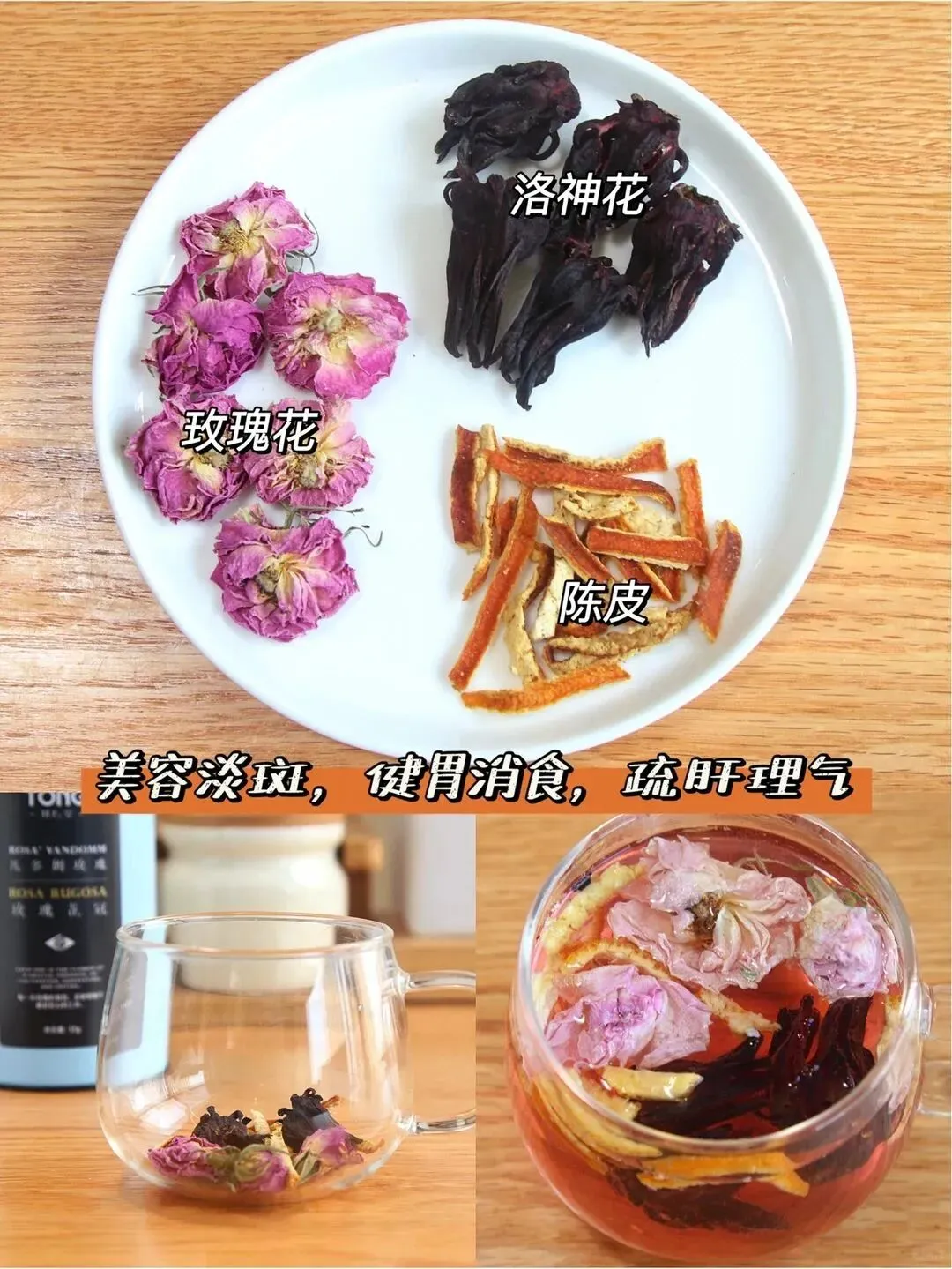 【具.体做.法】1. 洛.神花(也叫玫瑰茄)放2-3朵就.够了,这.花酸.味重。 2. 陈皮...撮,玫瑰花适量。 3. 用开水冲泡,洛神花.泡出来颜.色红红的特.别好看。
