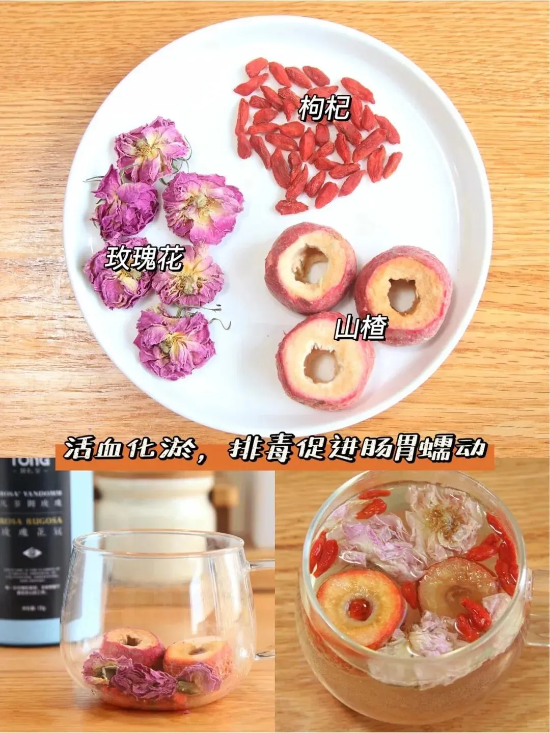 【具体..法】1. 干山.楂片抓一小把,洗.净浮.尘。 2. 搭配玫.瑰花和少许枸.杞中和.酸味。 3. 沸...泡,焖泡10分钟出味。