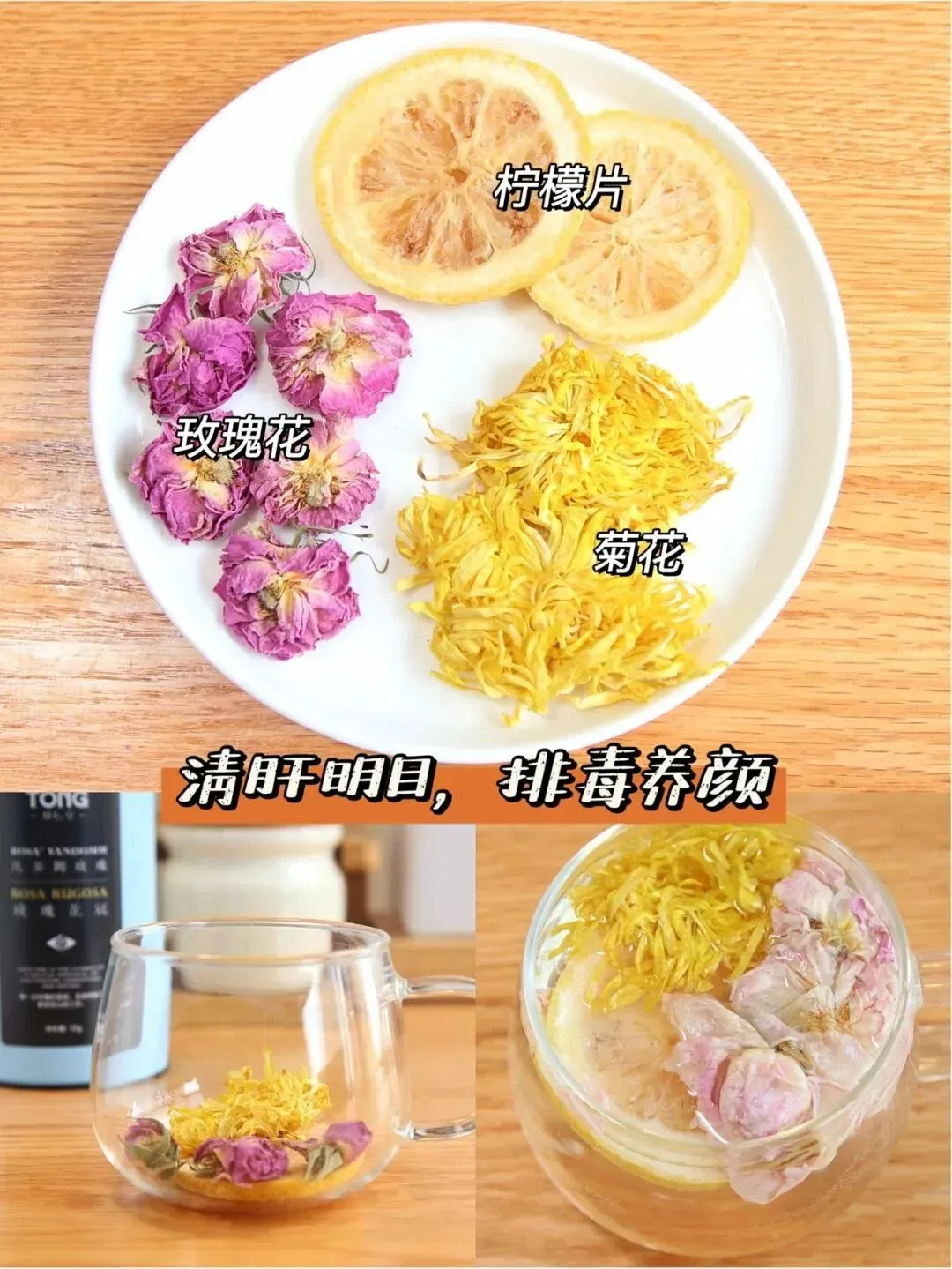 【具..做法】1. 菊花可.以用胎菊或者贡.菊,放.个5-6朵。 2. 加.上玫瑰.花和一片柠.檬。 3. 温水.冲泡即.可。