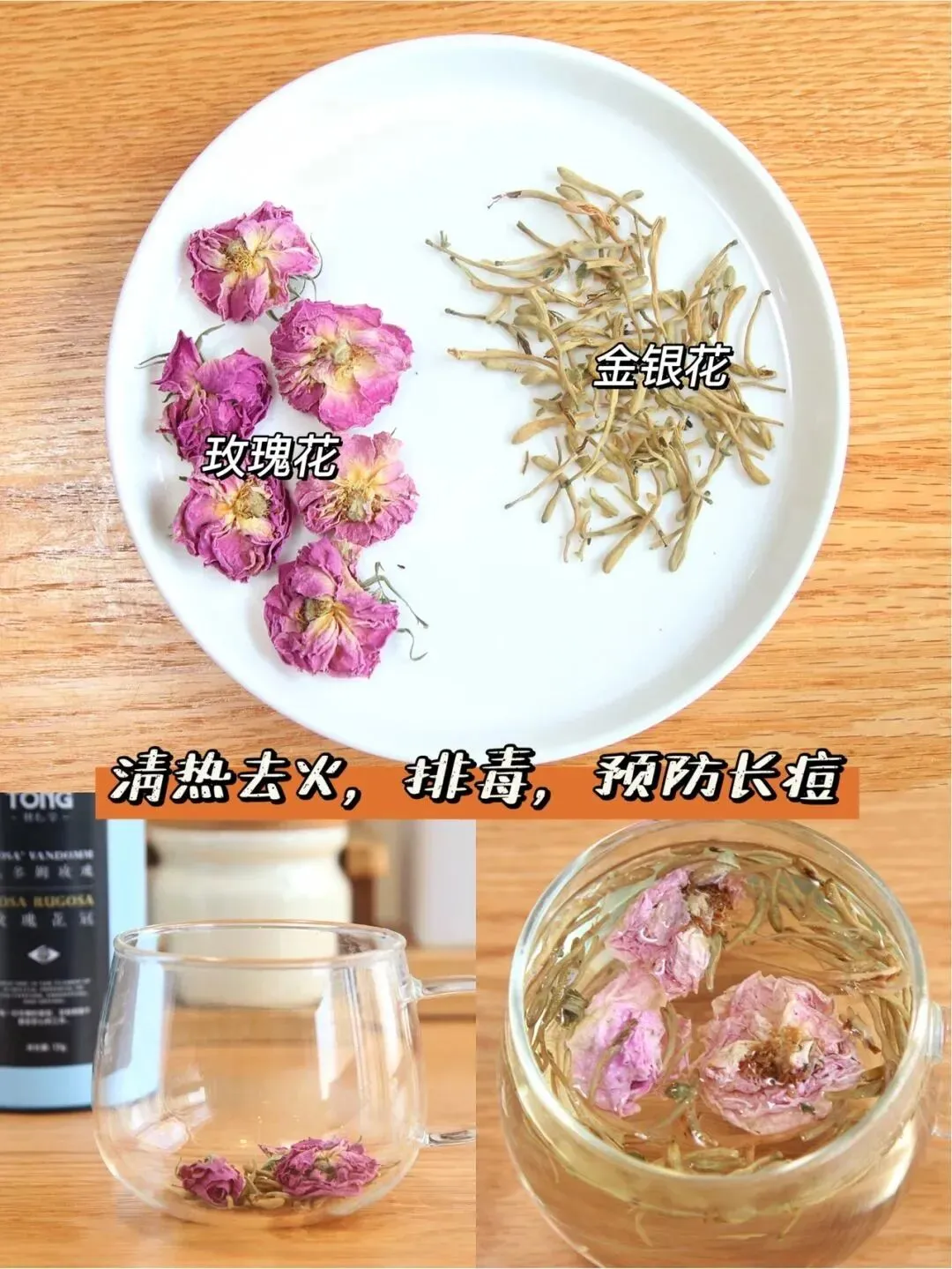 【具.体做.法】1. 金.银花性寒,量.不要太多,一小撮即.可。 2. 搭配温性的..瑰花,刚好寒热平.衡。 3. 沸.水冲.泡饮用。