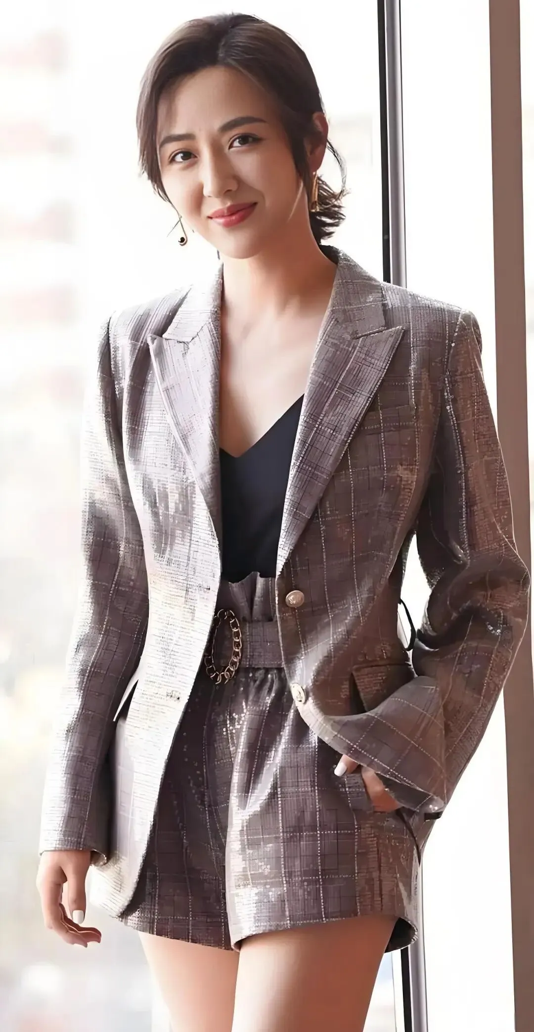 徐小飒曾以一袭“液体西装”亮相,其反光的材质在灯光下熠熠生辉,搭配深灰色调,既干练又高级。这种西装的修身剪裁完美勾勒出她的身材曲线,内搭黑色小背心更增添了一丝小性感,成为职场女性的经典模仿对象。