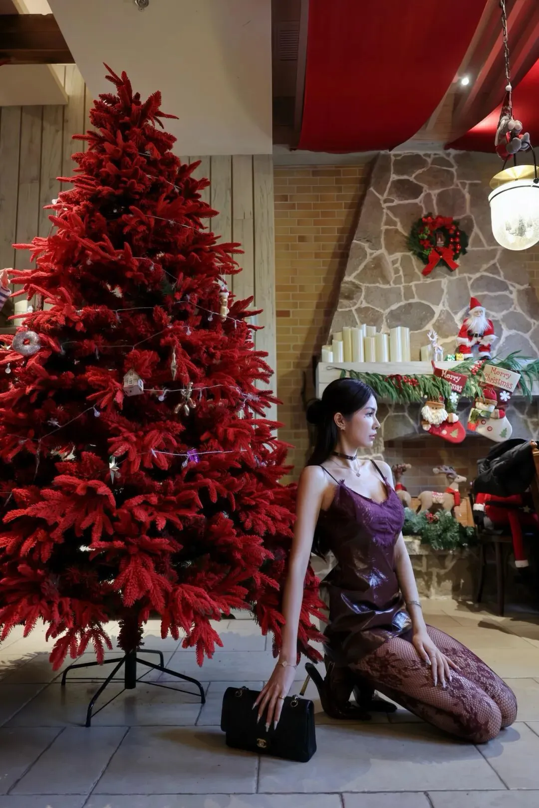 丝袜是女性时尚搭配中的重要元素之一,它能够修饰腿部线条,遮盖腿部的小瑕疵,如鸡皮、疤痕、色斑等,让腿部看起来更加光滑、细腻、均匀。在这组搭配中,丝袜能够为整体造型增添一份神秘与性感的氛围,使紫色蕾丝吊带裙的魅力得到进一步升华。同时,丝袜还具有一定的保暖作用,在春秋季节穿着既能展现美丽又能保持温暖。
