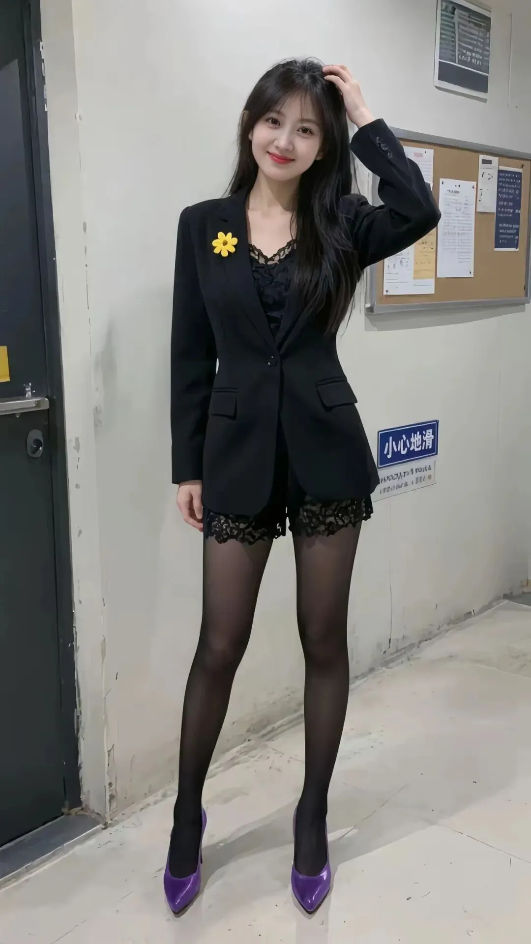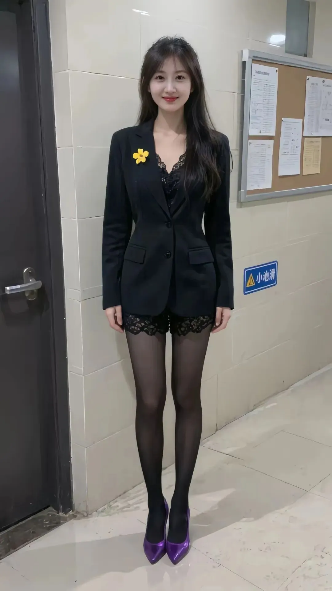 下身是同材质的蕾丝短裤,与内搭形成流畅的整体感。而腿上的黑色丝袜,则让整体造型的性感维度进一步提升,它勾勒线条,增添神秘,却因为整体的黑色调和西装的压制,丝毫不显俗艳。