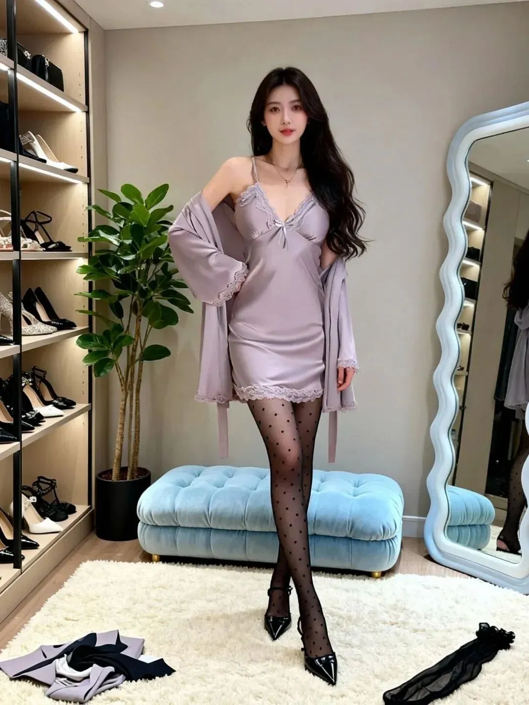 当前位置:首页>美女资讯>淡紫缎面睡衣丨蕾丝花边+小吊带,搭配波点黑丝,男朋友看了都移不开眼!