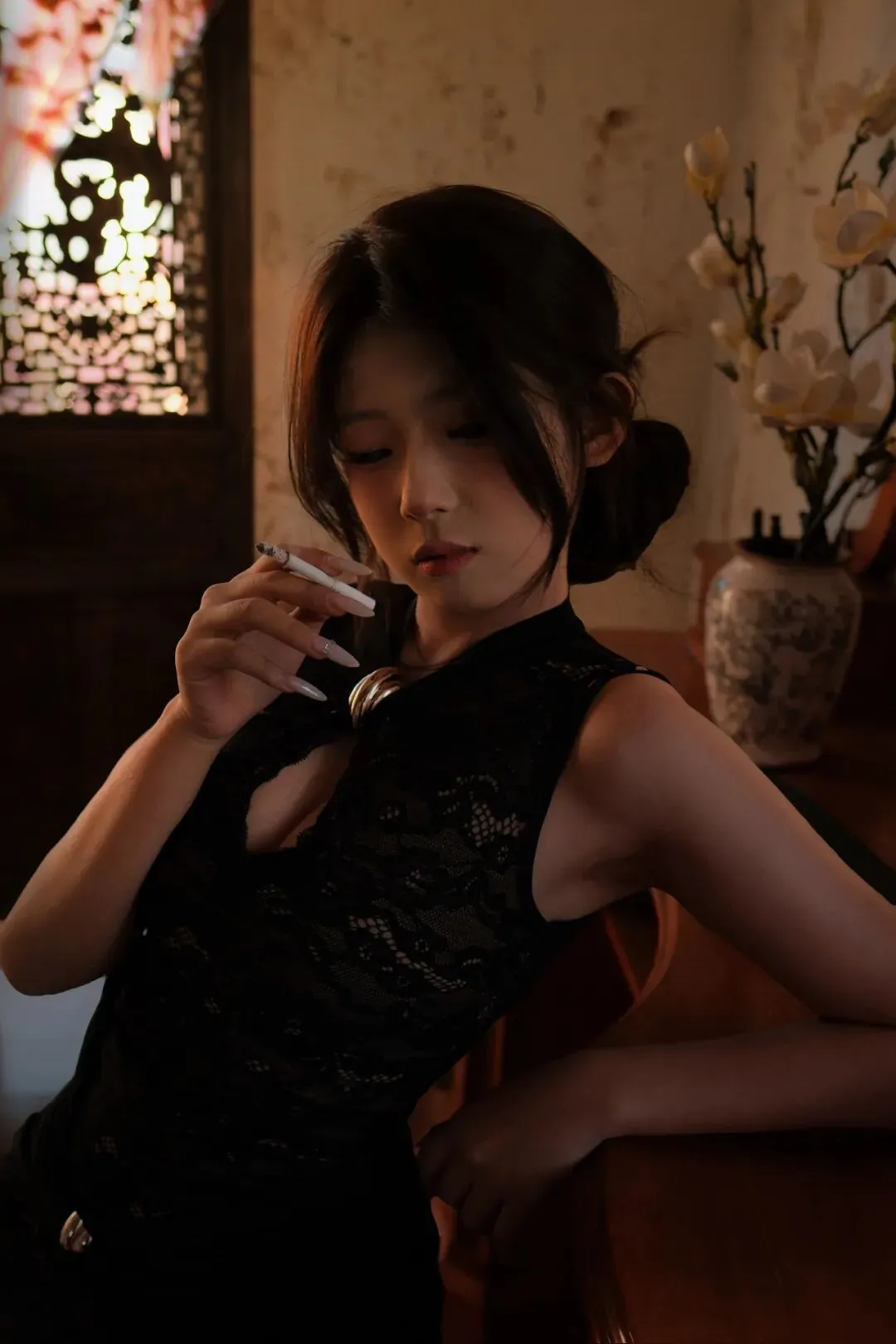 1. 复古写真拍摄:木质家具、雕花窗、钢琴房这类复古场景,和黑蕾丝旗袍的调性完美匹配,拍出来的照片自带故事感。