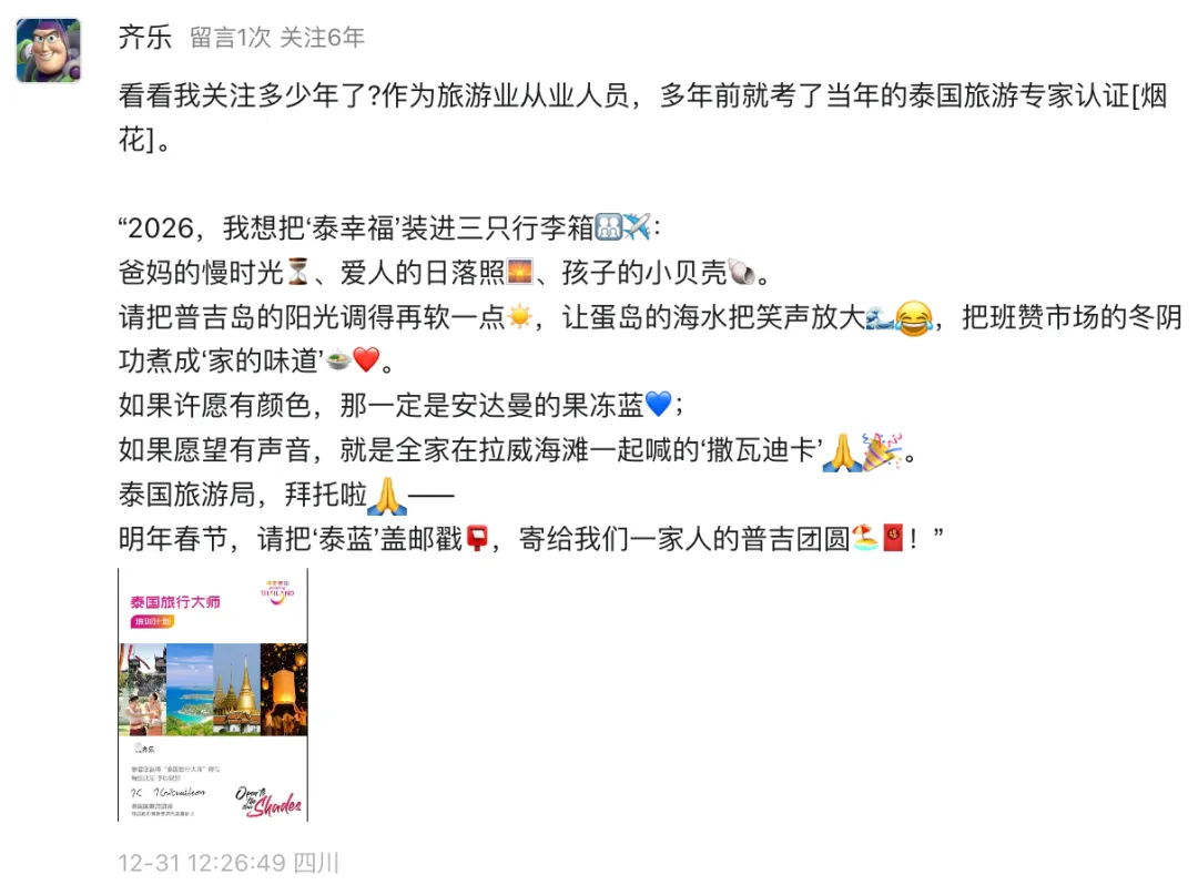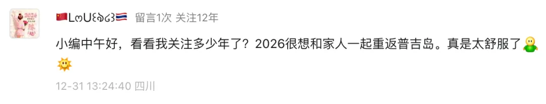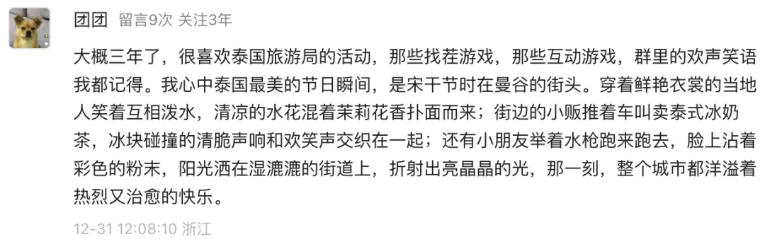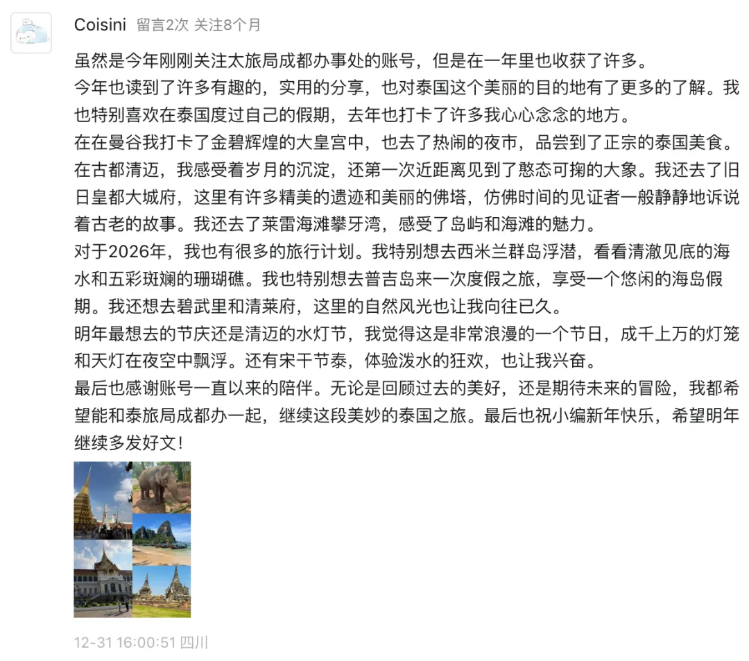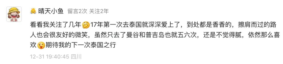 泰国国家旅游局成都办事处发起的“看看我关注多少年了”互动活动,收到了许多温暖的留言。我们精选了部分真挚回复,每一段文字背后,都是一颗热爱泰国的心。