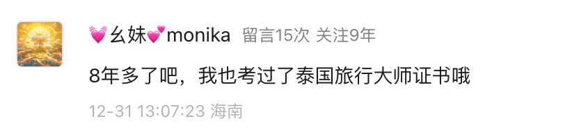 “8年多了吧,我也考过了泰国旅行大师证书哦”