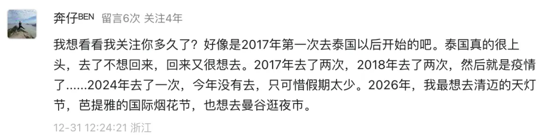 “泰国真的很上头……2026年,我最想去清迈的天灯节,芭提雅的国际烟花节,也想去曼谷逛夜市。”