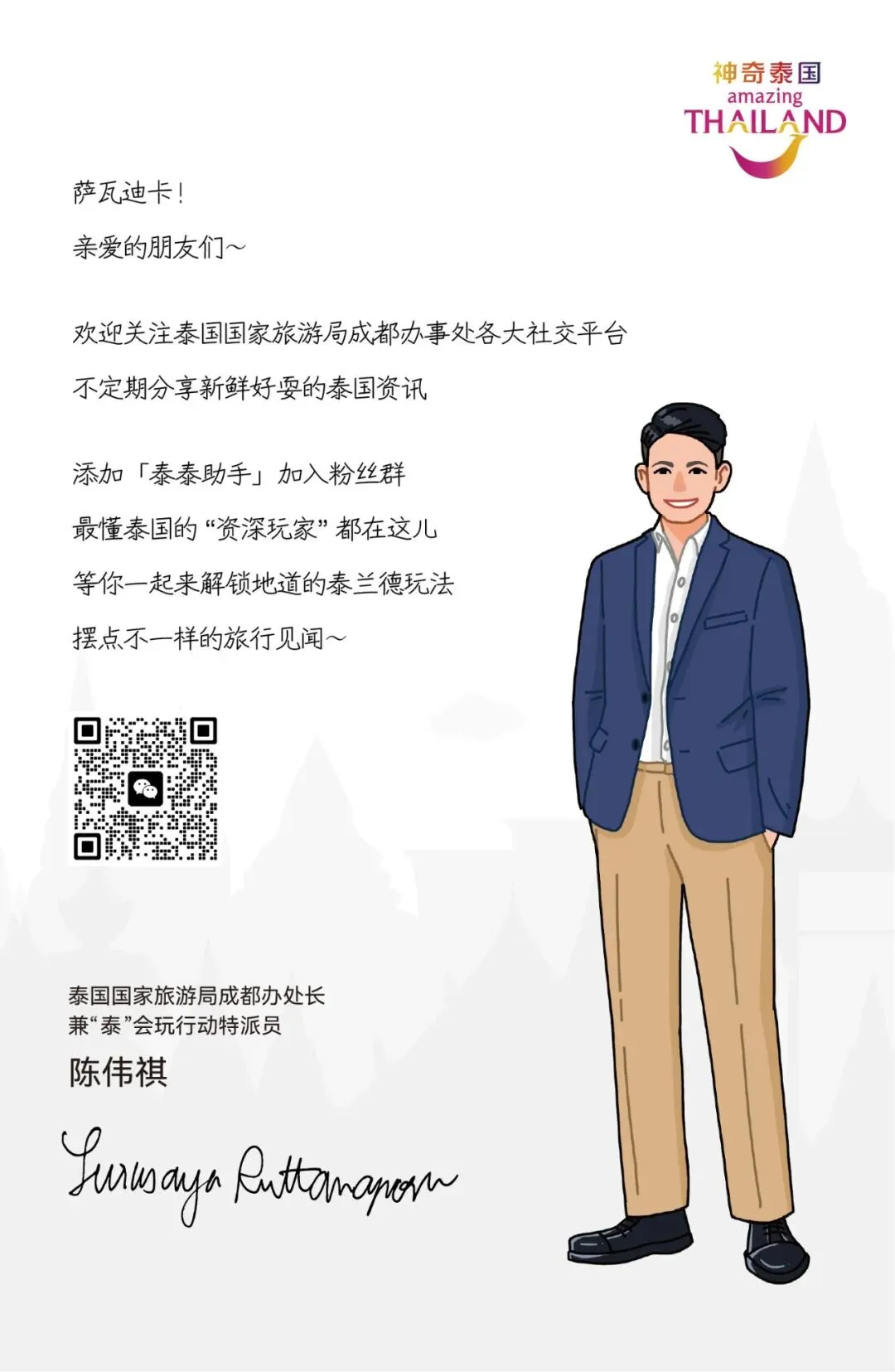 从关注12年的资深粉丝,到刚关注的新朋友从走遍泰国十余城的旅行达人,到每年必去的“后花园”从考取泰国旅行大师的专业人士,到被一句“萨瓦迪卡”治愈的普通游客……