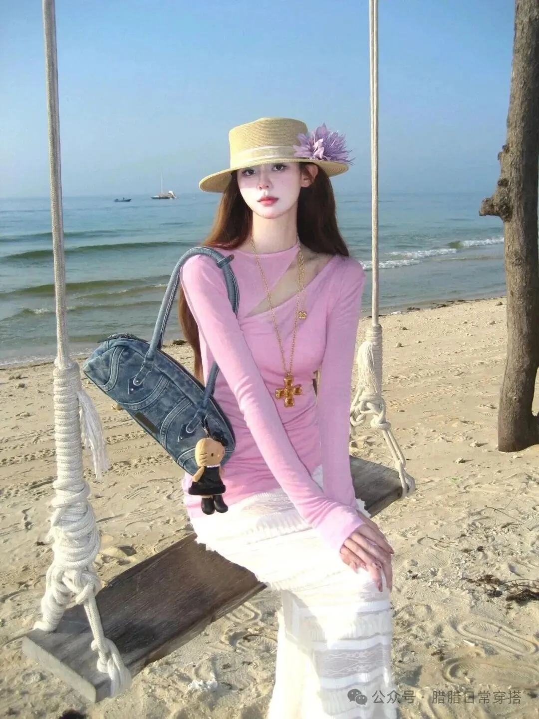 当前位置:首页>美女资讯>粉色修身上衣+白色蕾丝长裙,海边这样穿太温柔