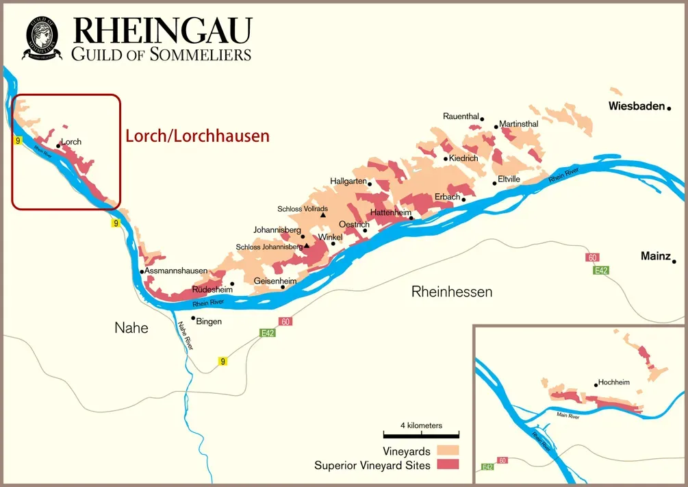Eva Fricke酒庄的葡萄园横跨莱茵高四大核心区域:哈滕海姆(Hattenheim)、埃尔特维尔(Eltville)、基德里希(Kiedrich)和洛尔希(Lorch),囊括了沙土、壤土、黏土、板岩、石英岩等产区标志性土壤。哈滕海姆是莱茵高重镇自不必言,埃尔特维尔、基德里希都来自莱茵高上游,可以孕育出果味直接、酒体开放的雷司令;而真正让Eva Fricke大展拳脚的地方,则是洛尔希Lorch。
