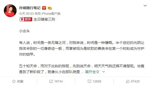 五年前,许晴发了一条生日微博,“今天我五十了,我的人生多了一份二十五岁的笃定、坦然与担当。”