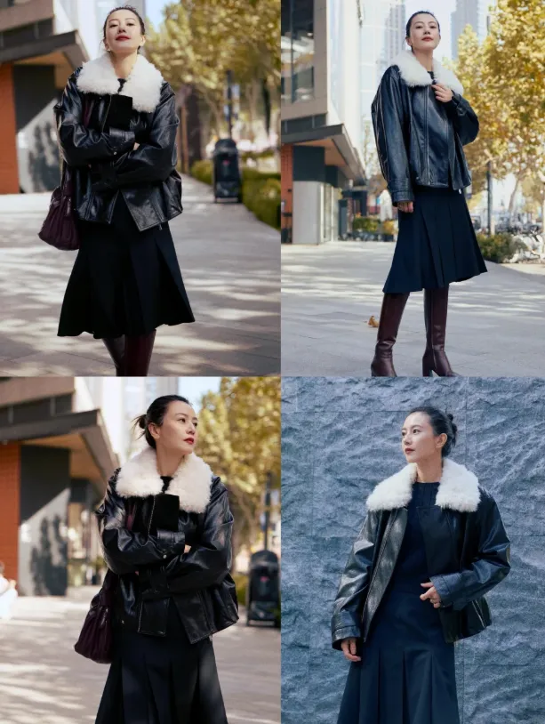 在满是冷冽酷感的皮夹克皮靴之间,巧妙融入一条轻盈雪纺裙,材质风格的形成穿搭视觉的反差,解了全皮质穿搭的厚重沉闷。硬朗皮质与柔媚雪纺的碰撞,让造型的层次感张力瞬间拉满而斜挎的牛角包,则为整体注入了慵懒诗人般的浪漫文艺氛围。这般搭配,无需刻意雕琢,便能将不费力的时髦诠释得淋漓尽致。