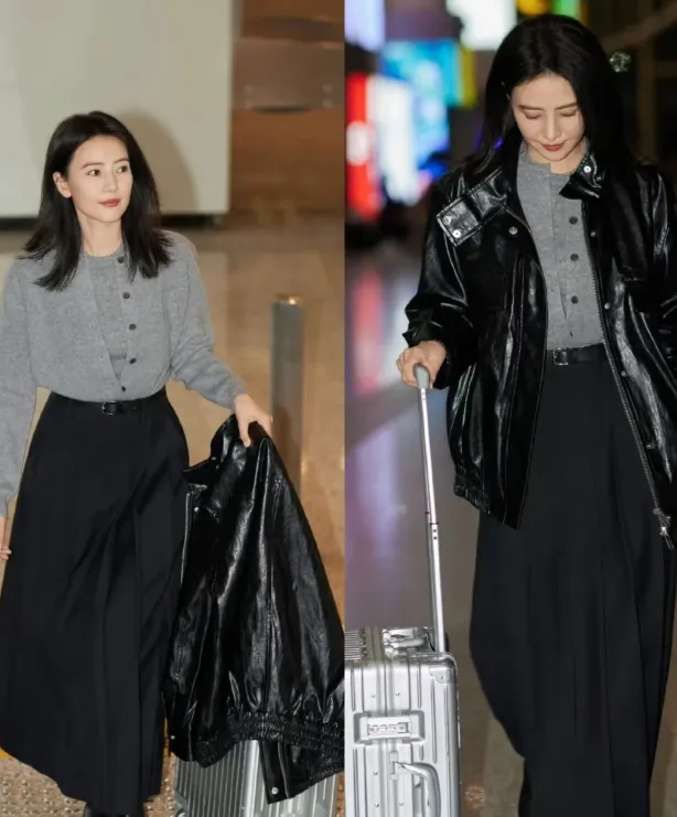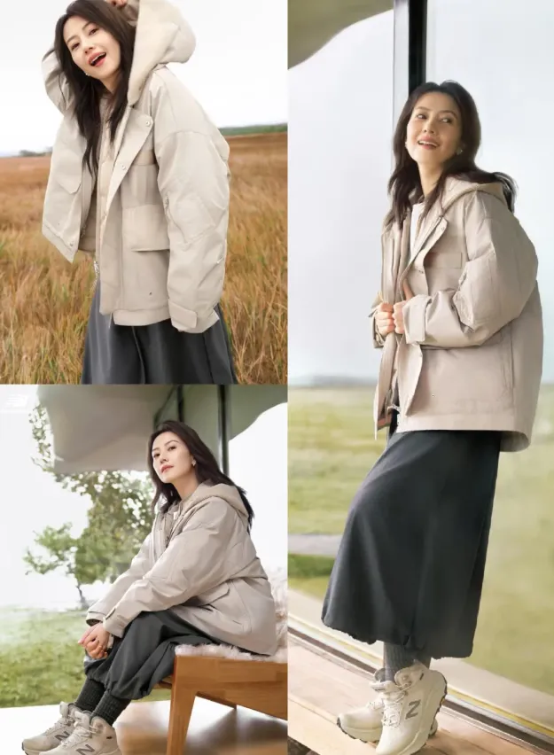 高圆圆向来擅长以简约基础的单品,塑造大气知性的个人风格。譬如米白色羽绒服和灰色半身裙的叠穿组合,无需繁复的配饰,便能轻松穿高雅和温柔的独特气质。