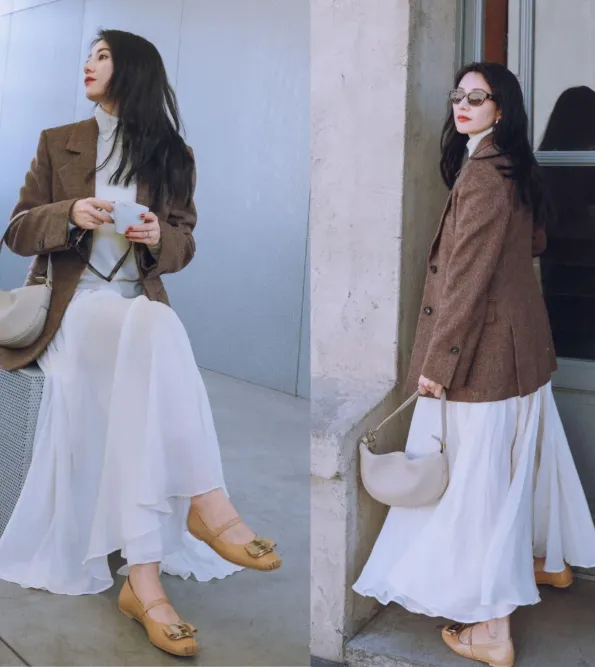 风衣、西装外套这类气质单品穿搭中常客。在日常穿搭的,她尤为青睐中长半裙这一品类,相较于裤装的利落干练,裙装更易烘托出女性独有的柔婉与优雅。