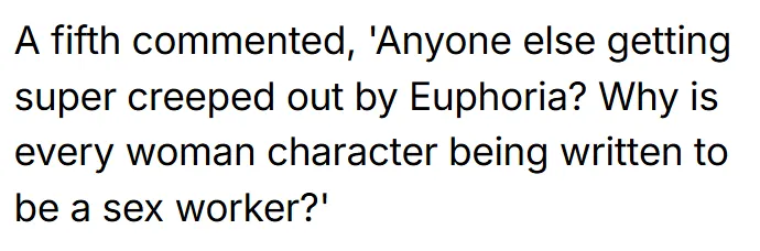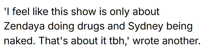 “我觉得这节目除了赞达亚嗑药和悉尼妹脱衣之外就没什么内容了。说实话,也就这样了。”