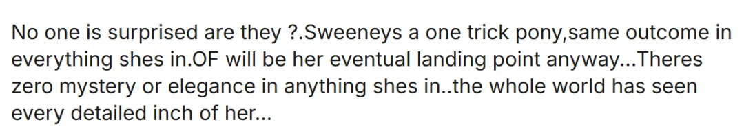 “没人会感到惊讶吧?她只会这一招,演的每部剧都一样,反正最终她都会落脚在性感上,角色都毫无神秘感或优雅可言。全世界都看过她的每一寸肌肤…”
